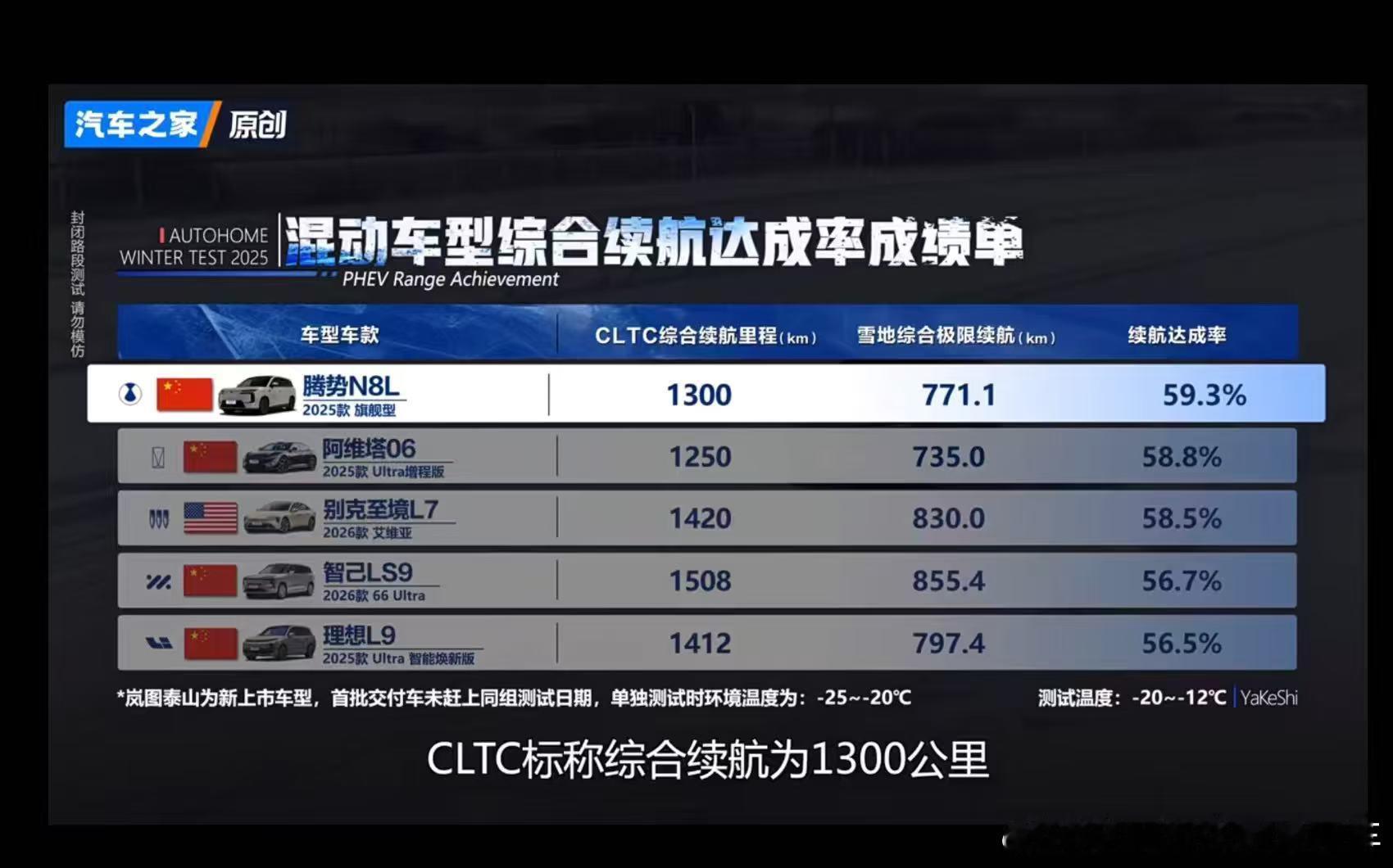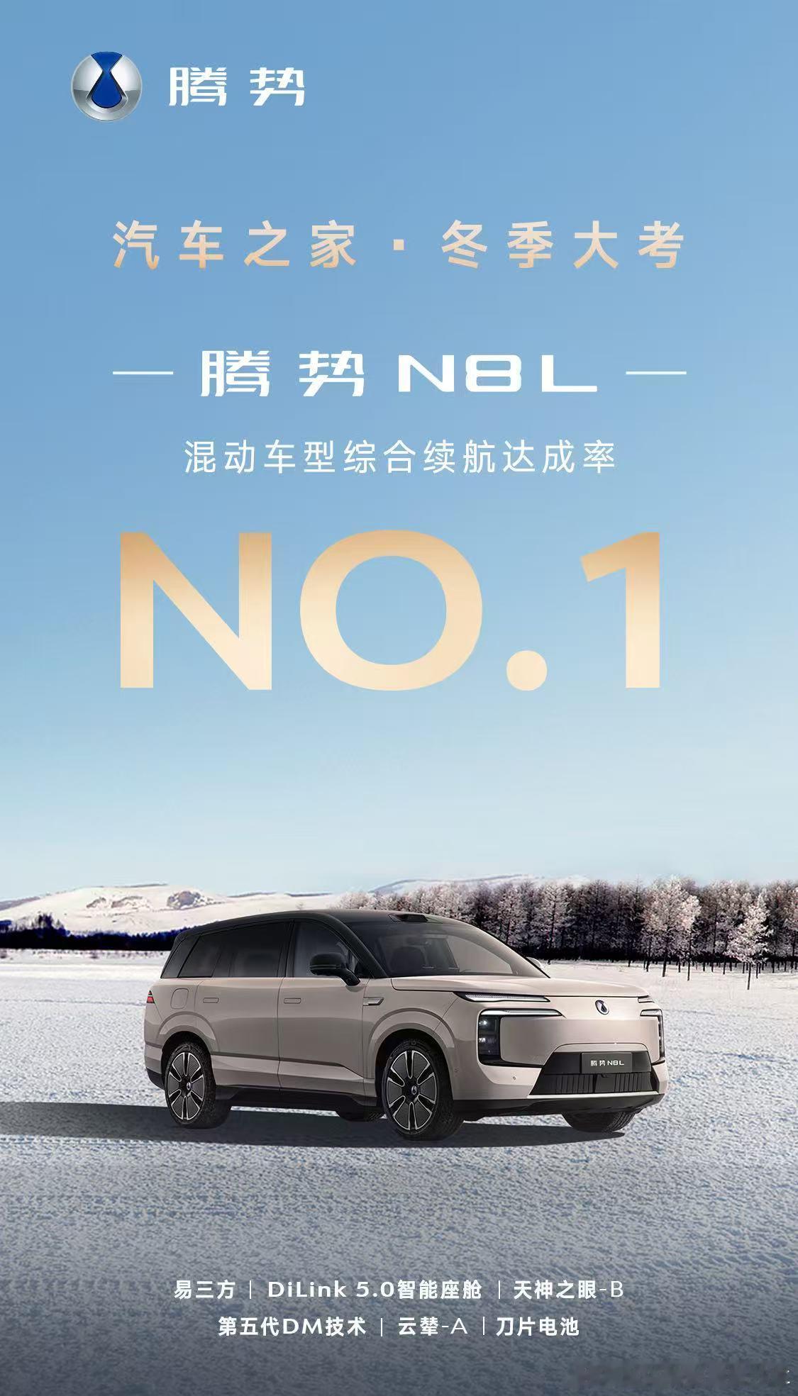 腾势N8L在2025汽车之家冬测里,拿下了全品类续航达成率第一,估计高兴惨了,这比啥营销都管用啊。成绩是771.1km,续航达成率59.3%。尤其对于一个2.0T+三电机插混车型来说,殊为不易。张局近期也在内蒙古呼伦贝尔参与了腾势的冰雪试驾体验,N8L这款车空调制热也很快,而且是分流层空调,上层是新风,很舒适,下层是循环风,腿脚不冷且热得快。另外就是易三方的冰雪极限高,做了多个科目,回头可以关注下我的视频。2025汽车之家冬测大V聊车