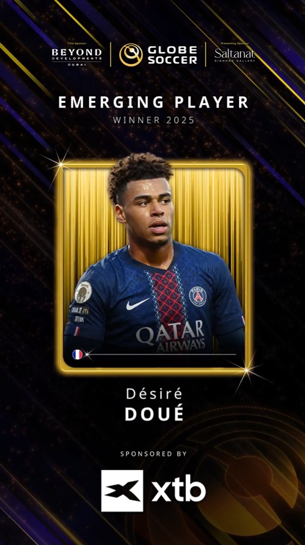 直播吧12月29日讯在2025年环球足球奖颁奖典礼上,巴黎圣日耳曼再次在个人奖项方面大获全胜,一举斩获多达七座奖杯。其中,法国国脚杜埃当选2025年度最佳新星球员。在颁奖结束后,杜埃接受俱乐部官网采访时,发表了获奖感言。