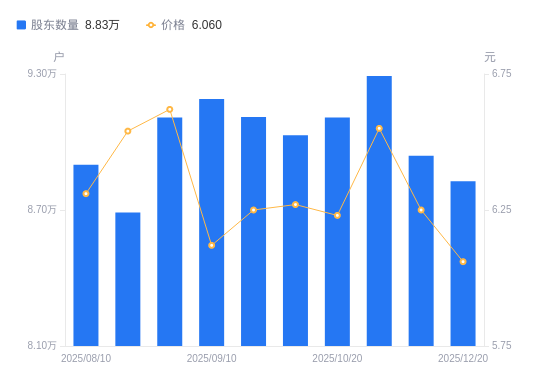 日期A股户数(户)流通A股户均持股数(股)户均持股市值(万元)2025-12-208826519982.1312.112025-11-308939419729.7712.332025-11-109291318982.5212.432025-10-209108519363.4812.062025-09-309029519532.9012.252025-09-209110419304.9012.072025-09-109189219139.3511.712025-08-319107919310.1912.782025-08-208689320240.4513.242025-08-108899419762.6012.47