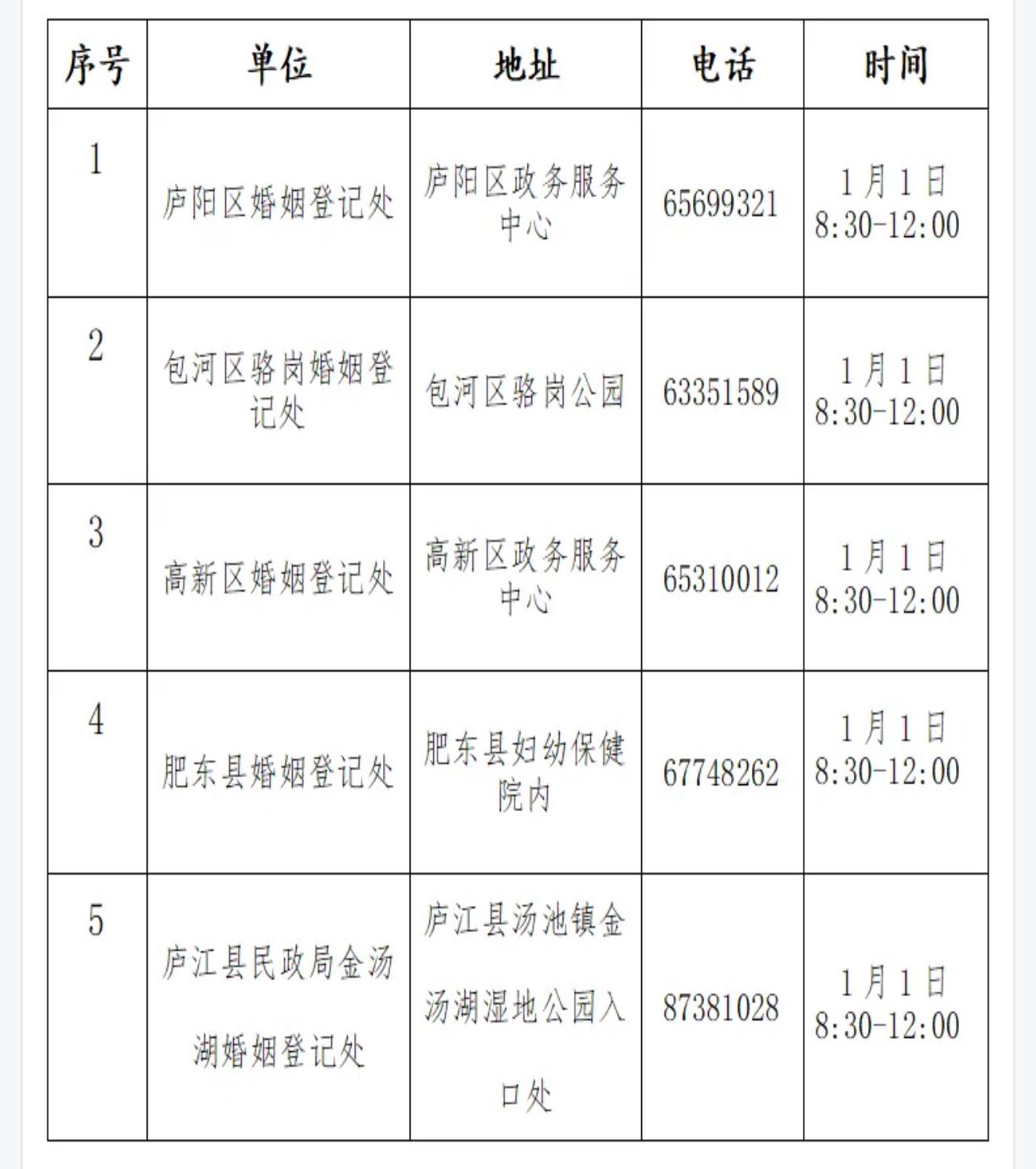 据了解,2026年元旦期间,除幸福坝婚姻登记处外,庐阳区婚姻登记处、包河区骆岗婚姻登记处、高新区婚姻登记处、肥东县婚姻登记处、庐江县民政局金汤湖婚姻登记处也将“为爱加班”。