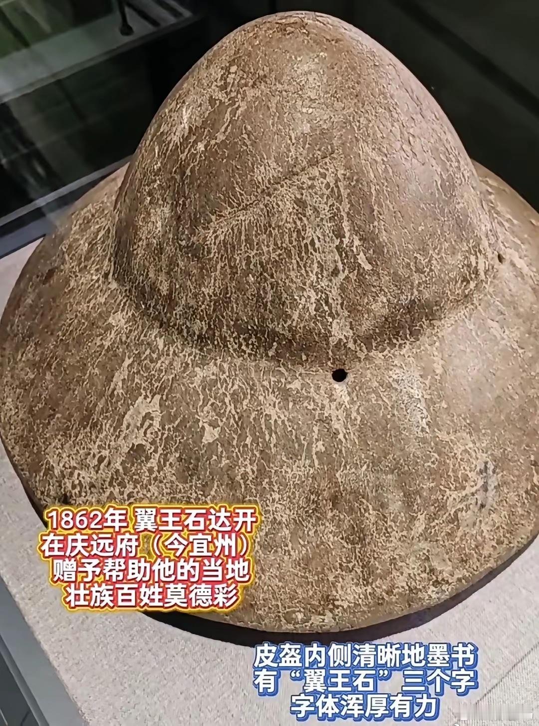 太平天国翼王石达开的皮盔。根据《宜山县文史资料》 等多份地方史志记载,太平天国爆发天京事变以后石达开出走,在宜山与当地一位名叫莫德彩的壮族百姓结下了友谊,在率军离开宜山前夕,石达开将自己随身携带的一顶皮盔和一柄战剑,郑重地托付给了莫德彩,因此保存流传到了今天。