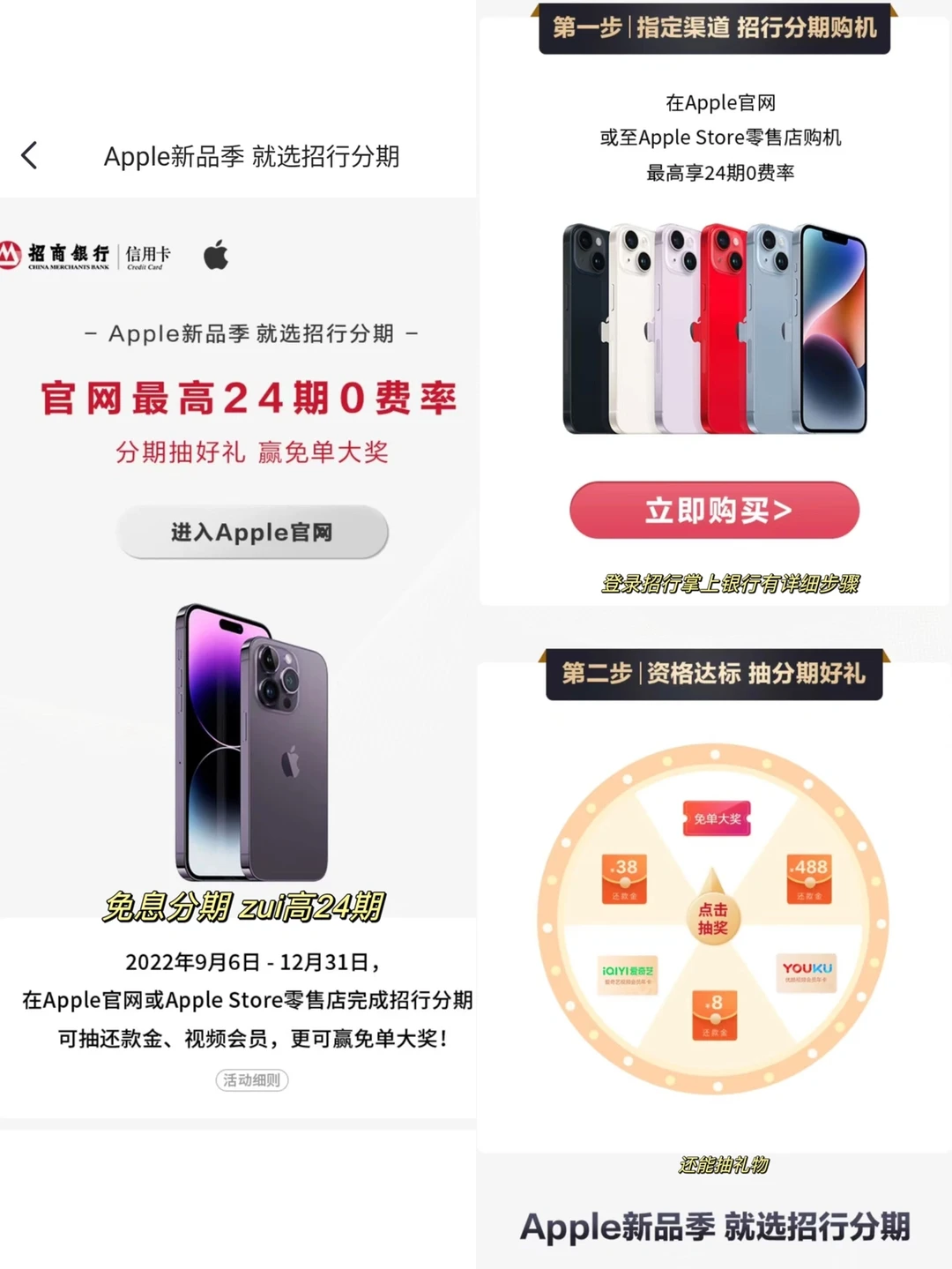 这两天iPhone14也新发布了,如果有意愿要换iPhone14的伙伴,可以在苹果官网用招商银行信用卡24期免息购,当然也有一次性付款,或者3、6、12期多种免息分期选择,免息分期购可让自己减轻负担呀~