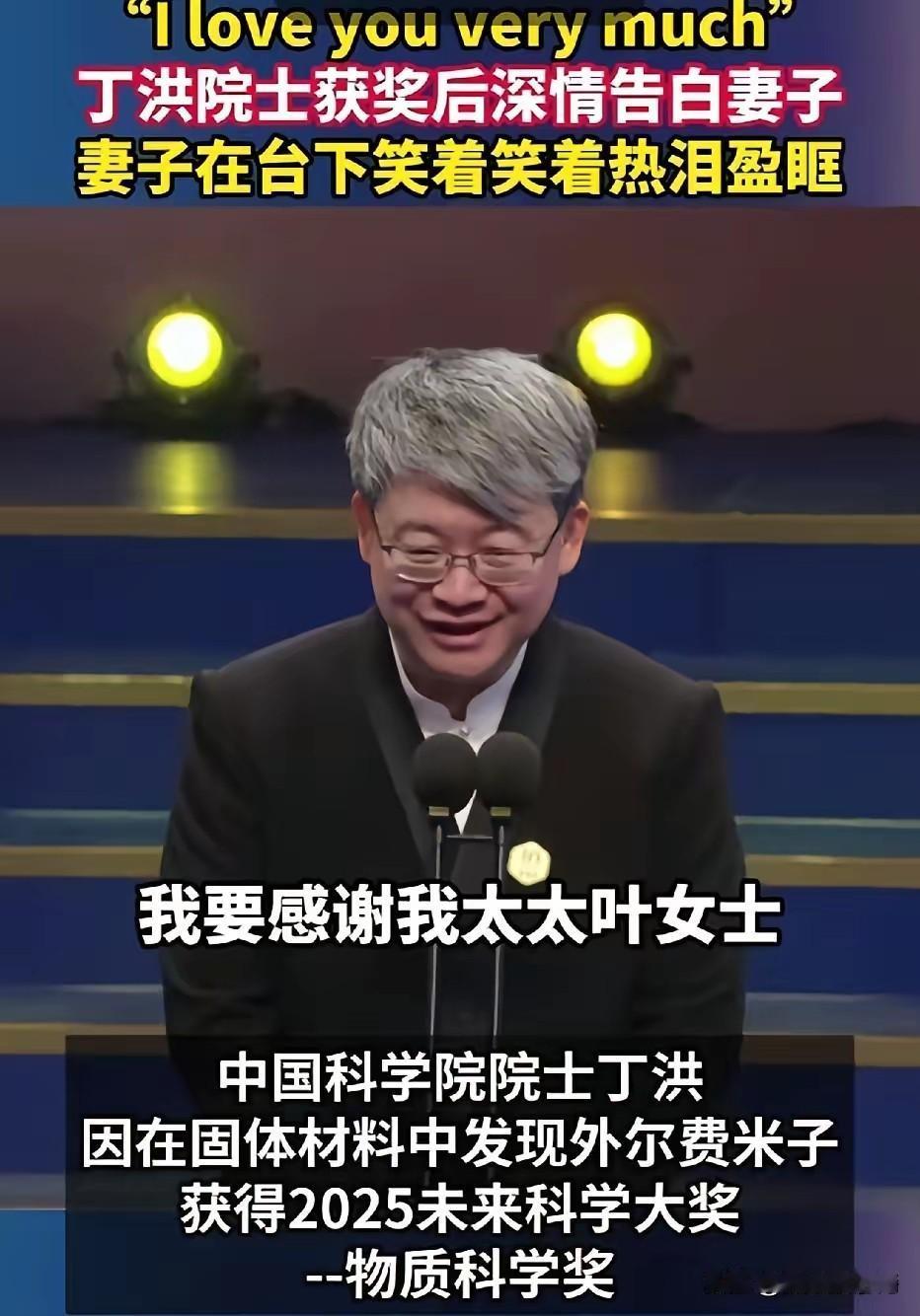 丁洪院士,在领奖台上说,我要感谢我的太太叶女士,34年前,你放弃了密歇根大学的全额奖,陪我在芝加哥读书。4000年前你放弃美国公司的高薪,坚定的支持我回国工作,三年前你放弃北京的羽毛球圈,毫不犹豫的随我来到上海。爱是一切,我非常的爱你。丁洪院士领奖台深情致谢妻子三次放弃,这份感恩令人动容。台下妻子笑中带泪,爱意满溢。成功背后是家人默默支持,他们相互成就,携手走过风雨,这是科研与生活的最美注脚,让人感受到爱与奋斗的力量!夫妻同心,伉俪情深,共同奋斗,卫我中华。图片素材来自网上。