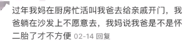 过年我妈在厨房忙活叫我爸去给亲戚开,我爸躺在沙发上不愿意去,我妈说我爸是不是怀二胎了才不方便