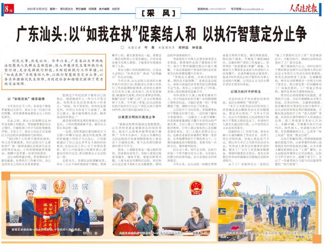 从执行和解的用心用情到强制措施的雷霆万钧,从家事案件的耐心说理到系列纠纷的高效化解,从为当事人解忧愁到给企业“上课”解忧,汕头法院始终秉持公正司法理念,以执行守护万家灯火、温暖千家万户,交出了一份兼具执行力度与司法温情智慧的“执行答卷”。