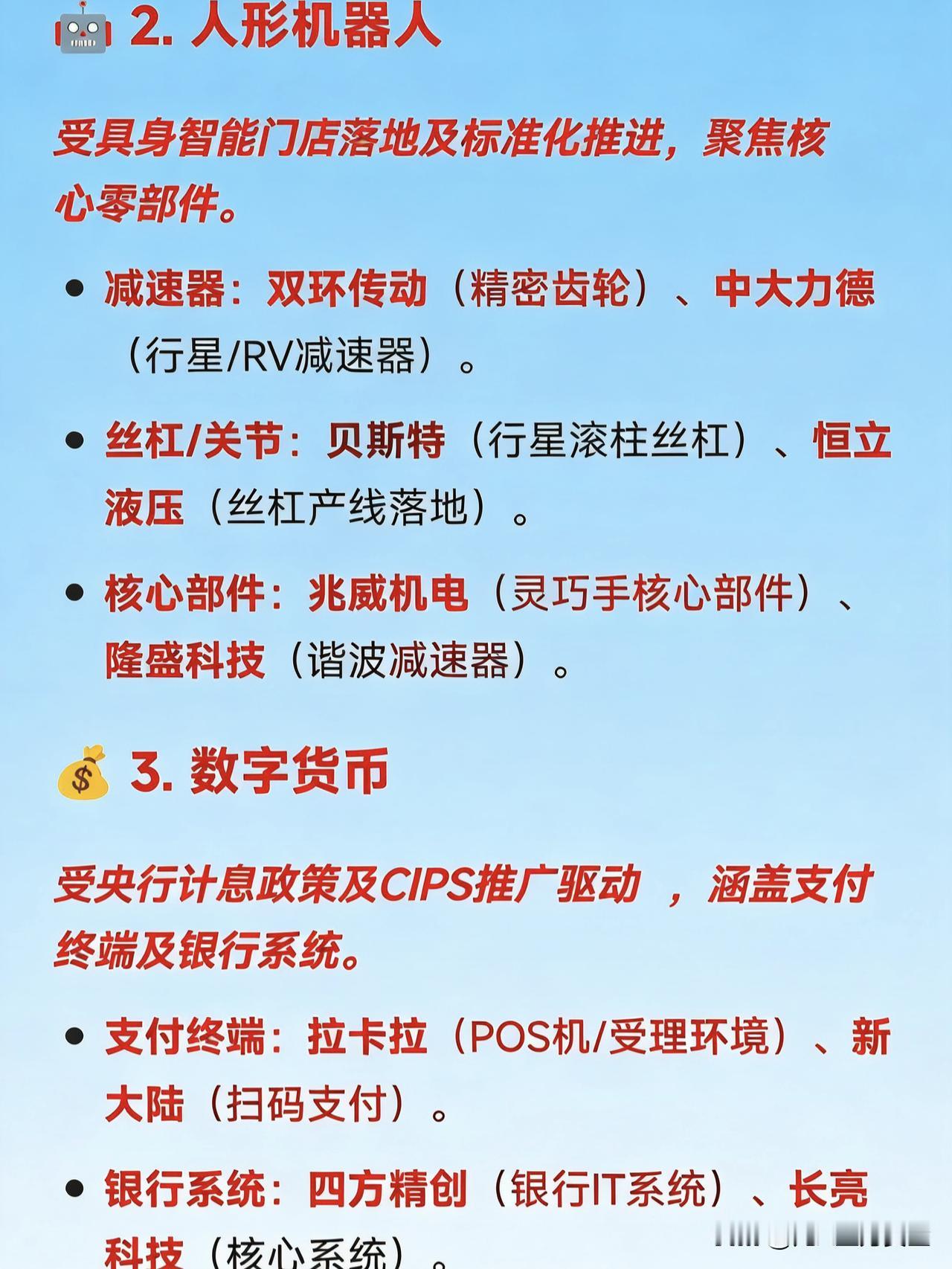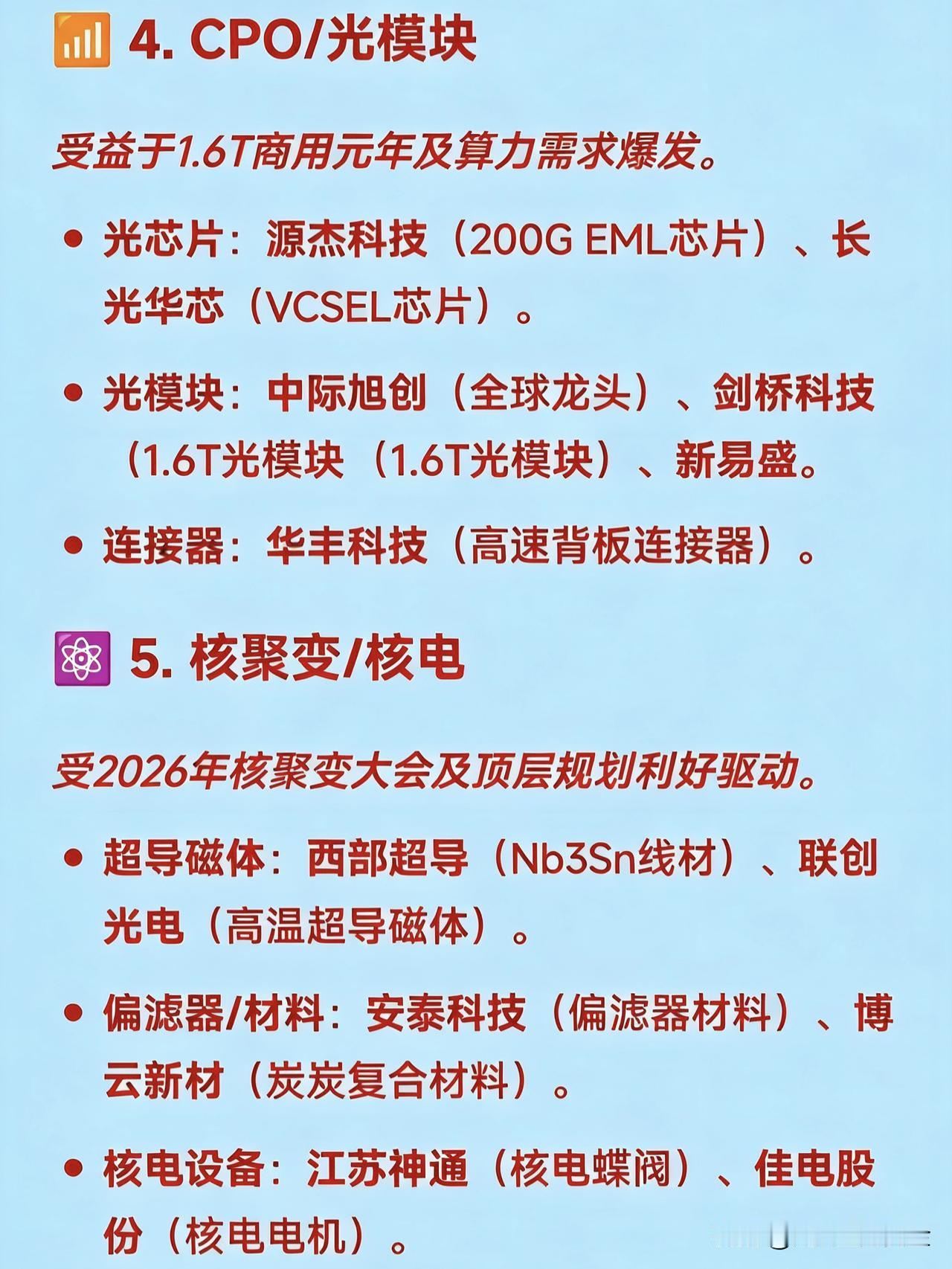 12月30日十大热点概念及产业链龙头梳理 🚀 1. 商业航天 受SpaceX上市预期及国内政策支持驱动,涵盖火箭制造、卫星及材料等环节。 碳纤维材料:光威复材(军用碳纤维龙头)、中简科技(航天高端碳纤维)、吉林化纤(大丝束原丝)。 火箭制造/配套:航天发展(指控通信)、神剑股份(星箭结构件)、雷科防务(星载雷达)。 地面设备/卫星:海格通信(卫星导航)、中国卫星(小卫星制造)。 🤖 2. 人形机器人 受具身智能门店落地及标准化推进,聚焦核心零部件。 减速器:双环传动(精密齿轮)、中大力德(行星/RV减速器)。 丝杠/关节:贝斯特(行星滚柱丝杠)、恒立液压(丝杠产线落地)。 核心部件:兆威机电(灵巧手核心部件)、隆盛科技(谐波减速器)。 💰 3. 数字货币 受央行计息政策及CIPS推广驱动,涵盖支付终端及银行系统。 支付终端:拉卡拉(POS机/受理环境)、新大陆(扫码支付)。 银行系统:四方精创(银行IT系统)、长亮科技(核心系统)。 安全芯片:楚天龙(智能卡)、华峰超纤(SIM卡硬钱包)。 📶 4. CPO/光模块 受益于1.6T商用元年及算力需求爆发。 光芯片:源杰科技(200G EML芯片)、长光华芯(VCSEL芯片)。 光模块:中际旭创(全球龙头)、剑桥科技(1.6T光模块)、新易盛。 连接器:华丰科技(高速背板连接器)。 ⚛️ 5. 核聚变/核电 受2026年核聚变大会及顶层规划利好驱动。 超导磁体:西部超导(Nb3Sn线材)、联创光电(高温超导磁体)。 偏滤器/材料:安泰科技(偏滤器材料)、博云新材(炭炭复合材料)。 核电设备:江苏神通(核电蝶阀)、佳电股份(核电电机)。 🔋 6. 钠电池 受锂电替代逻辑及涨价驱动。 正极材料:容百科技(层状氧化物)、振华新材。 负极材料:贝特瑞(硬碳龙头)、中科电气(锂电/钠电负极)。 电解液:多氟多(六氟磷酸钠)。 🧠 7. 脑机接口 受大会召开及太空实验预期驱动。 医疗设备:翔宇医疗(康复器械)、创新医疗(神经康复)、三博脑科(医疗服务)。 核心部件:海格通信(无线传输)、麦澜德(盆底康复设备)。 📡 8. 6G与量子科技 属于“十五五”未来产业核心赛道,技术预研领先。 6G研发:中兴通讯(太赫兹、通感一体)、中国电信(算力与空天通信)。 量子科技:国盾量子(量子通信设备)、神州信息(金融政务应用)。 📦 9. 仓储物流 受现代物流标准化计划驱动。 核心标的:德邦股份、嘉诚国际、新宁物流、华贸物流。 🧶 10. 碳纤维/被动元件 受原材料涨价及需求回暖驱动。 被动元件:风华高科(电感/电阻)、顺络电子(功率电感)。 碳纤维:光威复材(全产业链)、中复神鹰(高性能碳纤维)、吉林碳谷(原丝)。