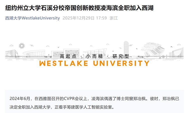 12月29日,西湖大学宣布:纽约州立大学石溪分校帝国创新教授、IEEEFellow凌海滨全职加入西湖大学工学院,受聘讲席教授,牵头创立智能计算与应用实验室。