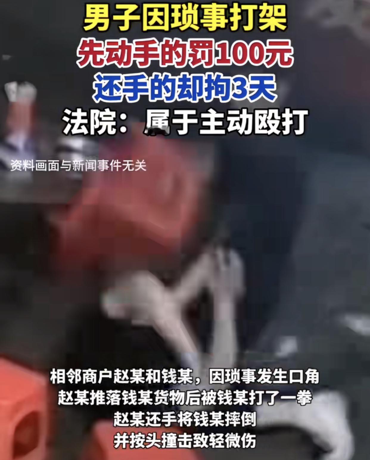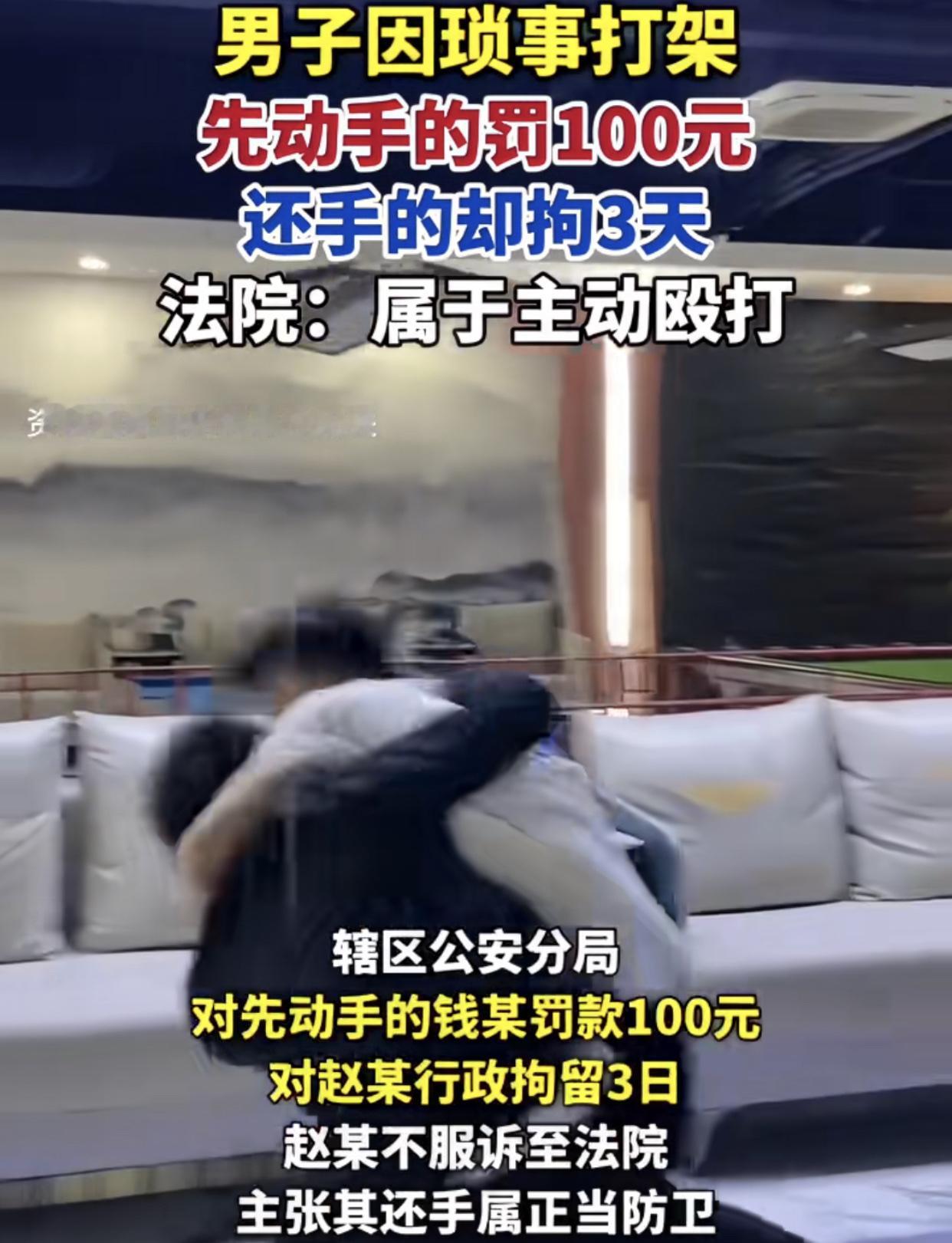 判了! “先动手的罚款100,还手的拘留3天!” 广西柳州两名男子,因摊位琐事,动手打人男子因不满对方多次将自己摊位上的商品推倒地下。男子连续的挑衅,气愤下打了对方一拳后停手,事情到这结束的话,事情也就过去了,也相对公平。 但挨了一拳的男子哪肯罢休,不单还手还把该男子放倒在地,按着男子头部多次猛击地面,致其受伤,那就明显超出了自卫范畴。“有人先动手打我,我不还手?难道惯着他?我不打得他不能还手,难道让他找机会继续打我?”打人者提出了疑惑。 首先要搞清楚,是你先推落人家东西,别人打了你一拳也算防卫,打了你人家不在攻击,你转而攻击人,就应该算故意伤害了。 不要一味认为别人先动手你还手就是正当防卫,无论把别人打多严重就不负责后果了,这种认为是片面的,要使矛盾不升级,不造成严重后果,是双方都适可而止,而不是认为自己占理就无限度攻击对方,甚至将对方致于死地,那就大错特错了。