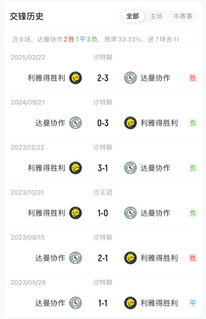 利雅得胜利联赛十轮全胜积30分位居沙特联榜首,各项赛事已8连胜;达曼协作联赛4胜3平3负积15分,近5场各项赛事保持不败。C罗加盟后,利雅得胜利对阵达曼协作7场仅获两场胜利。