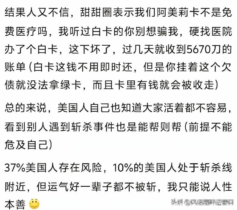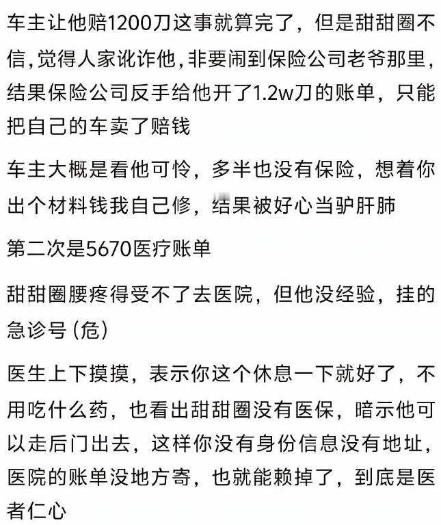 甜甜圈这样的偏执型人格,其实已经没有希望了。甜甜圈在2022年8月份跑去了美国,之后就每况愈下,现在直接成为了大街上的流浪汉了。甜甜圈的局面,已经进入了一种斩杀线模式,就是每天靠乞讨和打赏度日,坚持不了太久。 甜甜圈每天都生活在各种的聚光灯下,不知道来自哪里的镜头之下,导致甜甜圈一直觉得自己被各种监视。实际上没人监视甜甜圈,只是甜甜圈的名声太大了,那些去美国的华人,各种看见甜甜圈就曝光一下。导致甜甜圈自己不知道什么时候,就被放到了网上,可不就觉得自己被监视了吗? 而且说实话,甜甜圈本人应该有部分精神疾病,就是那种偏执型狂躁症。认定了一条路,就九头牛拉不回来的那种,明明已经在美国混不下去了,马上都要饿死的人了,甜甜圈还觉得自己当初的选择没错。因为甜甜圈必须要一条道走到黑,回也回不来,那只能用无数次告诉自己的选择没错,实际上错了也不认,认了也没用。因为认了也回不来,那只能不认自己犯错,只能一条路走到黑。 甜甜圈现在斩杀线之上活着,如果美国突然来一场从北方大寒流的话,一夜之间,可能会带走很多流浪汉的生命,包括甜甜圈。所以甜甜圈也就是祈祷自己不被寒潮所侵袭,要不然连一床被子都没有,在半夜找地方睡觉都没有,那冻也会冻死的。 另外甜甜圈不一定能吃饱肚子,又冷又饿的晚上,长夜漫漫,别说从七八个小时,就是三五个小时都撑不过去,尤其是到了后半夜,那冷得会透彻心骨,会把人彻底给带走了。。