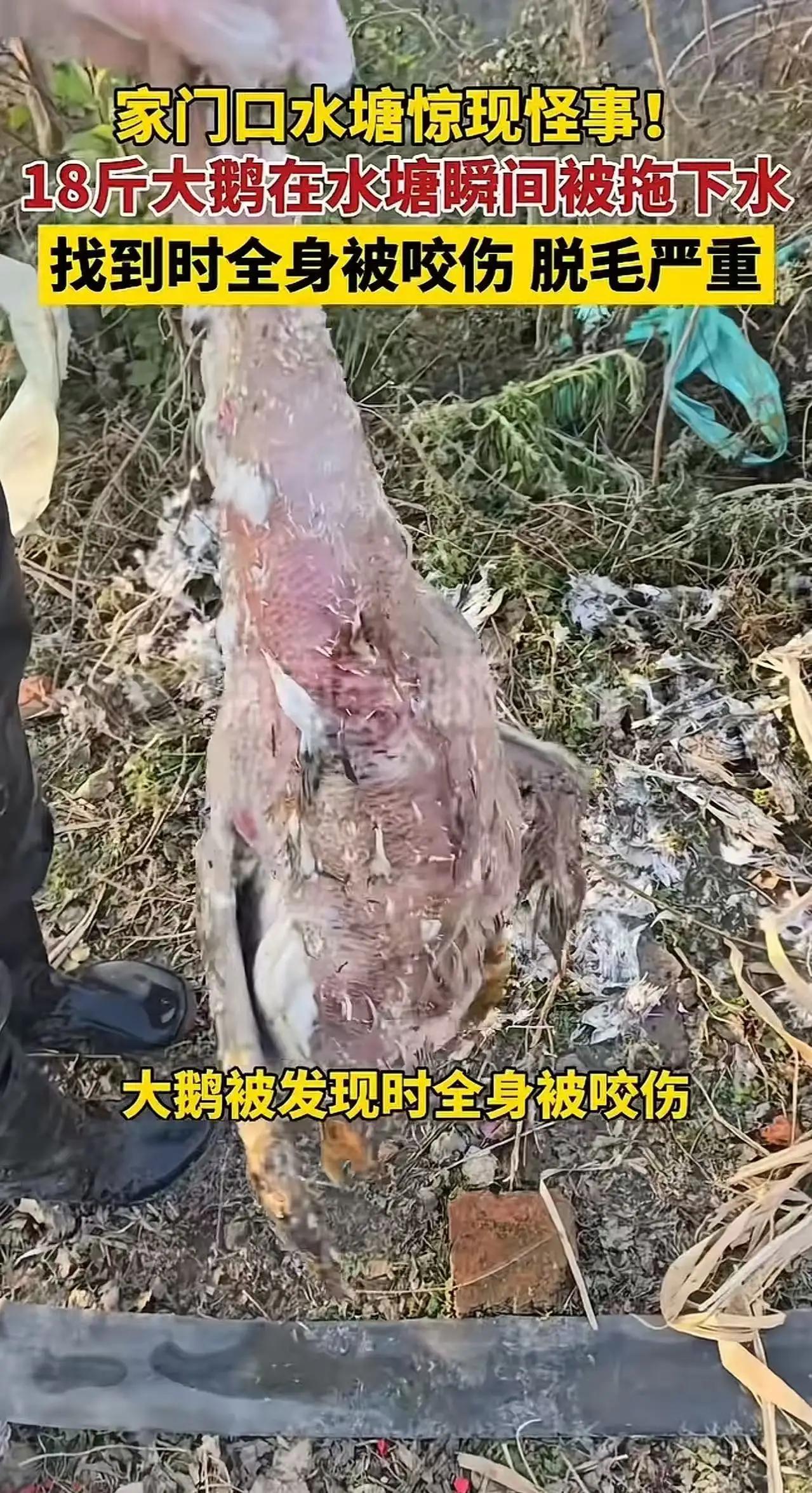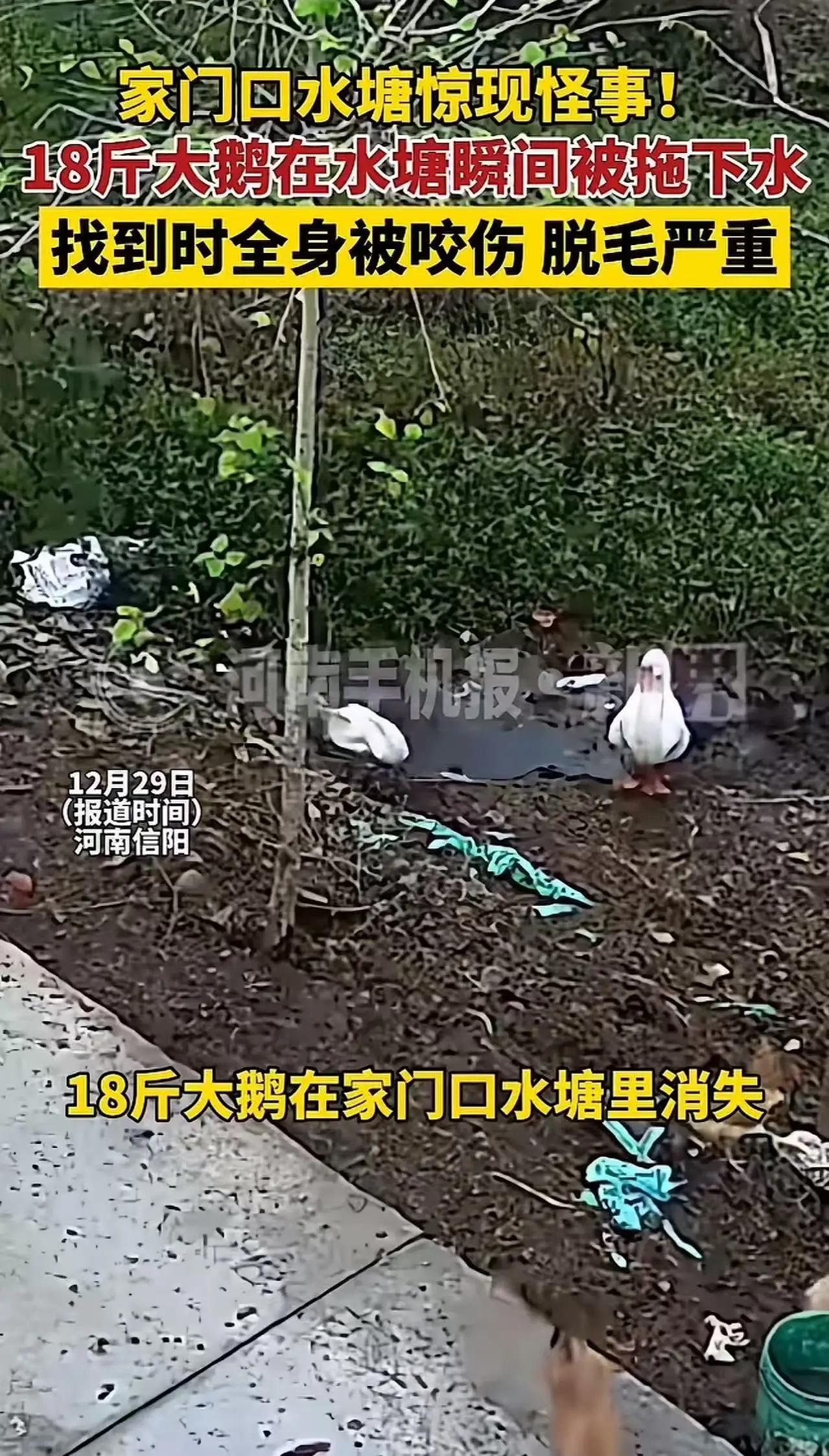 河南信阳农家水塘惊现“隐形杀手”,18斤大鹅瞬间被拖入水底,抽干水后真相更让人脊背发凉! 最近,河南信阳一户农家门口的水塘,发生了一件让全村人头皮发麻的怪事。曹先生家一只18斤重的大白鹅,好端端在水塘边溜达,竟在监控下一秒被拽进深水,连个水花都没溅起。 这可不是普通的丢鹅,监控画面仿佛恐怖片开场。大鹅入水瞬间,像被无形的手扼住喉咙,扑棱两下就消失得无影无踪。水面很快恢复平静,只剩几圈涟漪,看得人心里发毛。 曹先生起初以为有人偷鹅,看完监控却惊出一身冷汗。水塘最深不过两三米,平日看着普通,谁能想到里面藏着这种“狠角色”?他不敢轻易下水,密密麻麻的水草像一层绿色迷雾,掩盖着未知的危险。 消息传到网上,瞬间点燃了千万网友的好奇心。有人猜测是巨型黑鱼作祟,有人说恐怕是外来物种鳄雀鳝,甚至有人联想到深藏淤泥的鳄龟。各种说法交织,让这个平静的水塘蒙上神秘色彩。 在网友的催促下,曹先生借来水泵决心抽干水塘。这一抽,竟牵出更离奇的线索——村里不止一家丢过鹅,有的农户早就发现家禽莫名消失,只是未曾深究。看来,这“隐形杀手”已潜伏多时。 随着水位下降,真相逐渐浮出水面。失踪的大鹅终于找到,身上四五处伤口触目惊心,羽毛脱落大半,明显经历过激烈挣扎。但诡异的是,水塘里并未发现任何大型生物,只有邻居家丢失的几只鹅,早已化作森森白骨。 这一幕让围观村民倒吸凉气。如果真是凶猛水族所为,为何只伤不食?若是自然溺水,伤口从何而来?谜团像滚雪球般越滚越大,连经验丰富的老农都摇头称奇。 有生物专家推测,这可能是外来入侵物种的“游戏之作”。像鳄雀鳝这类凶猛鱼类,有时捕猎并非为了进食,而是出于本能攻击。它们潜伏在浑浊水域,一旦有活物经过便突然袭击,得手后甚至弃之不顾。 更值得警惕的是,类似事件并非孤例。近年来,多地河道、池塘都出现过家禽神秘失踪案例,背后往往指向随意放生的外来物种。这些生物缺乏天敌,肆意繁殖,已悄悄改变了许多乡村的生态平衡。 曹先生的故事,像一面镜子照出现代乡村的隐忧。当我们沉醉于科技带来的便利时,却可能忽略了身边自然环境的微妙变化。一口普通水塘,或许就藏着超出认知的生物密码。 此事也提醒我们,面对自然需永怀敬畏。人类与野生动物的界限日益模糊,每一次随意放生或生态破坏,都可能埋下意想不到的伏笔。乡村振兴的路上,生态安全这门课,我们得好好补上。 目前,当地相关部门已介入调查,水样和痕迹正在检测中。无论结果如何,这起事件都已敲响警钟——守护家园,从了解脚下的每一寸土地开始。 (来源:AHTV第一时间、河南乡村观察、网友实地采访综合) 乡村奇闻 生态警钟