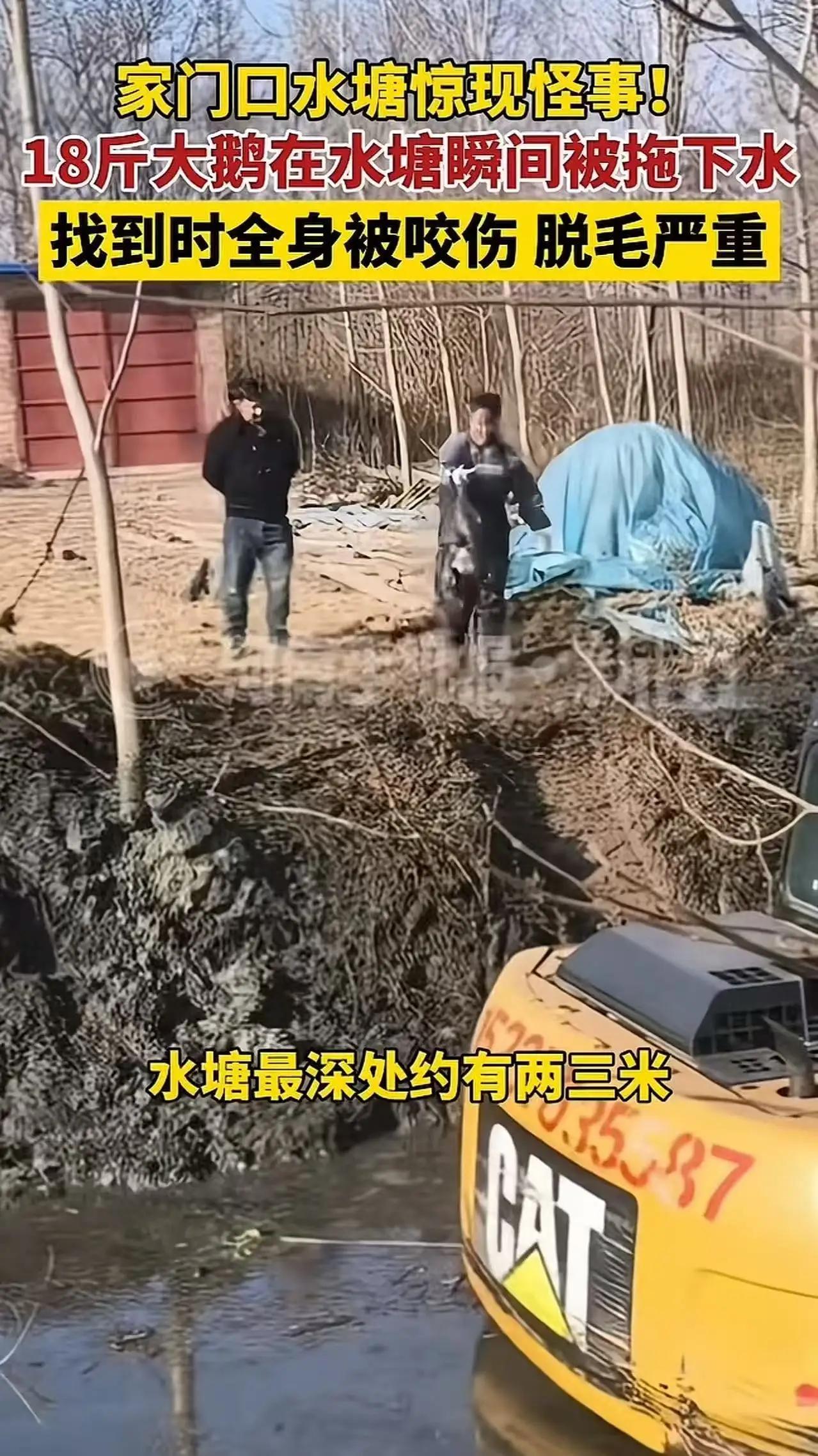 河南信阳农家水塘惊现“隐形杀手”,18斤大鹅瞬间被拖入水底,抽干水后真相更让人脊