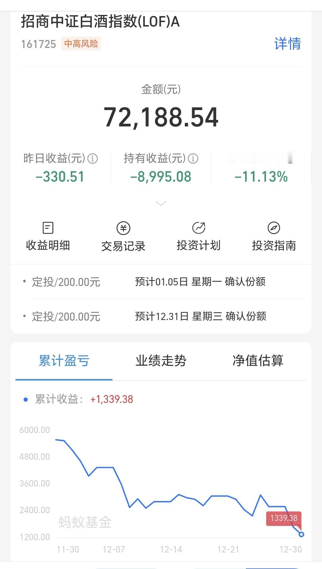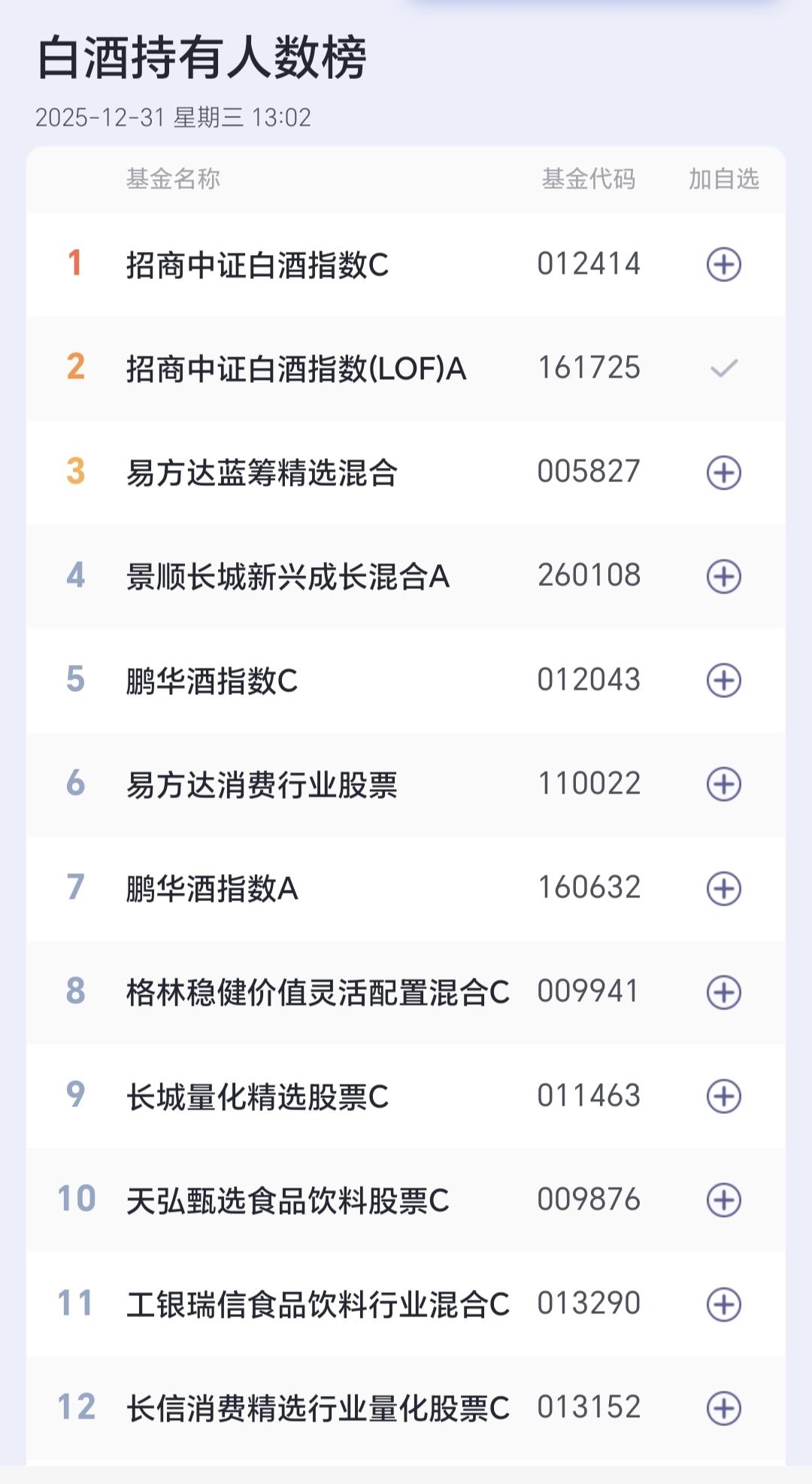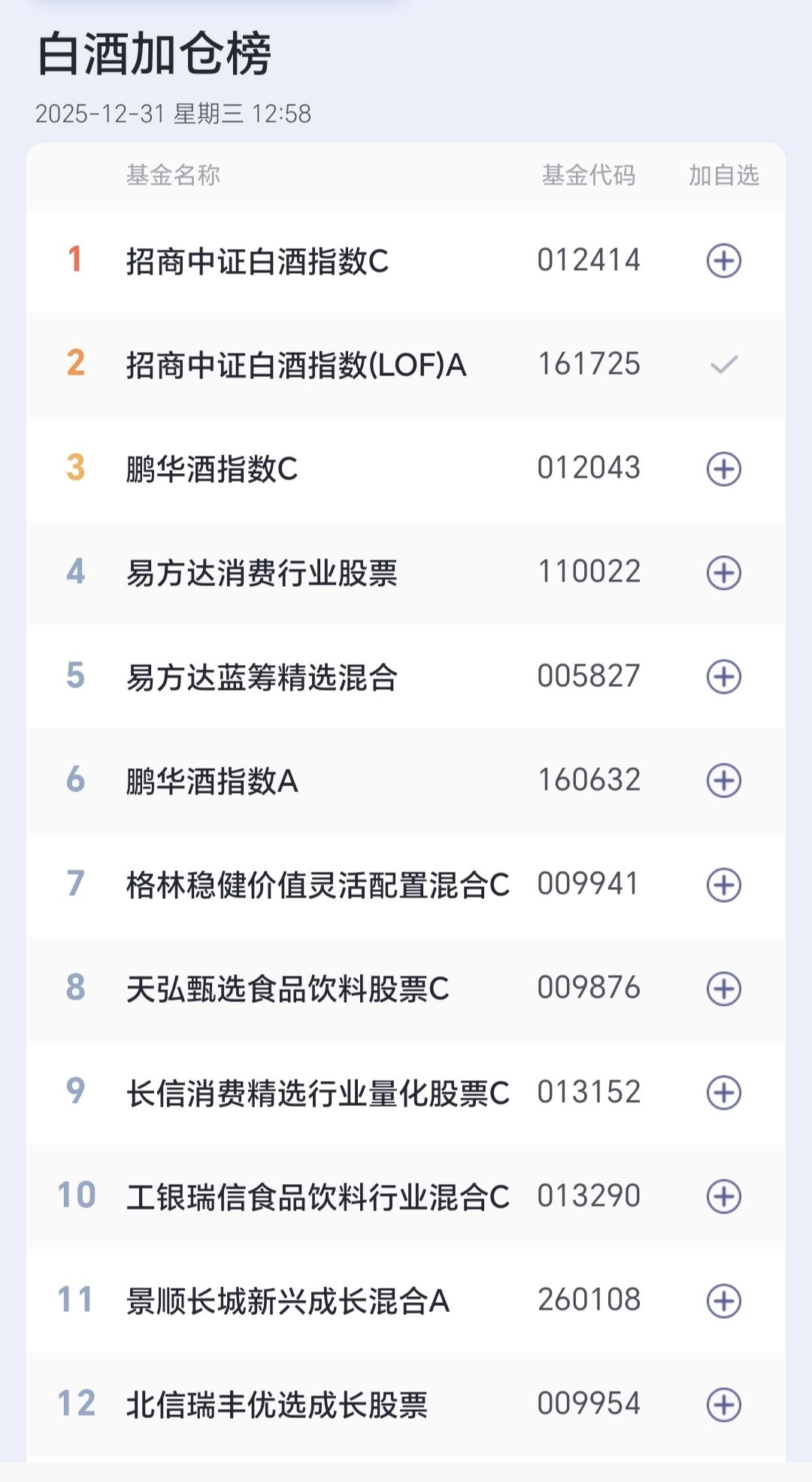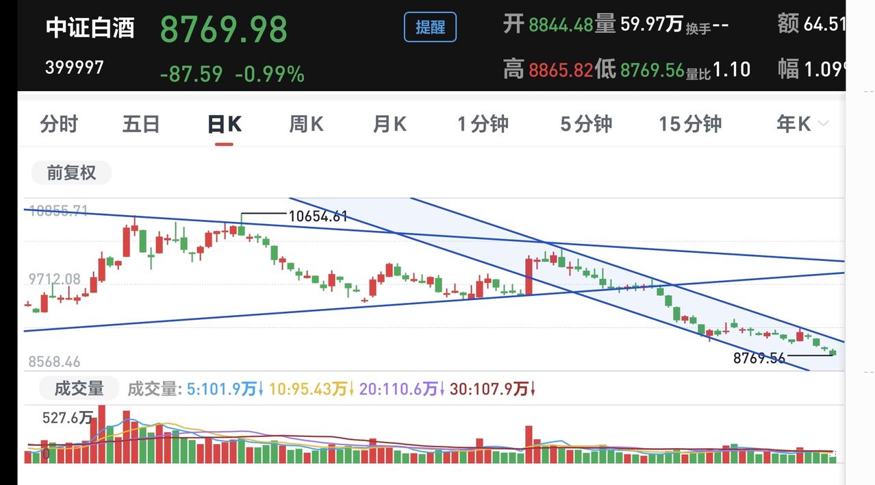 基金:白酒板块有可能是将来的高位板块 白酒板块继续下跌,今天是连续下跌的第四天,现在盘中估值下跌了0.65%,有人在笑,有人在哭,笑的人是我,因为,我今天定投的200块钱,比昨天定投的成本又低了1.3元,也可以这样说,我今天定投进去的200块钱,比昨天定投进去的200块钱,多捞了一些筹码,你不要小看这一点点的筹码,这就是将来挣钱的本钱。哭的是劝我不要进场白酒的人,老杨就是一个顽固不化,怎么点拨他都不会醒,他们是气极而泣。 白酒板块今天加仓排行榜见下面的截图3,持有人数排行榜见下面的截图4,排名第一的都是招商中证白酒。 我们来看一下下面的截图5,这是白酒板块日K线图,从图中可以看出,我画了两条平行向下的斜线,这是白酒板块日线级别短期下跌通道,现在的位置处于这个下跌通道内,也就是说,白酒板块日线级别短期处于下跌趋势中,白酒板块周线级别和月线级别的趋势线就不画了,因为也都是处于下跌通道中。 想进场白酒板块的人,可以观察日线级别短期下跌通道,如果上涨突破下跌通道的上轨,可以考虑要不要进场,今天的下跌又创了年内的新低,也就是说,今天进场的成本是2025年最低的,这个板块基金我已经超过了七成仓,现在是每天200块钱定投,直到10万块钱满仓为止,白酒板块基金,我的持有情况见下面的截图6。 需要注意的是,我的总资金是180万,我白酒板块的满仓是10万,白酒板块的仓位占比是不高的,使它继续下跌,也不会对我的整体盈亏有很大的影响,现在只是做一个潜伏,只要有耐心进行潜伏,早晚有一天会闻到酒香的,俗话说,好酒不怕巷子深,这个下跌通道就是巷子,只要你继续往前走,一定能走到巷子的尽头,这个时候我们就可以把酒言欢,而有些人会继续哭,那将会是一把鼻涕一把泪,因为,他们既没有潜伏到低位板块,还又被高位板块套住了,到时候他们有可能会这么办,止损现在的高位科技类板块,追高将来的白酒板块,这一天会有的,这一天会是在2026年。 我每天都会分享我的观点,我的观点只代表我个人的观点,不能作为你操作的依据,据此操作后果自负。