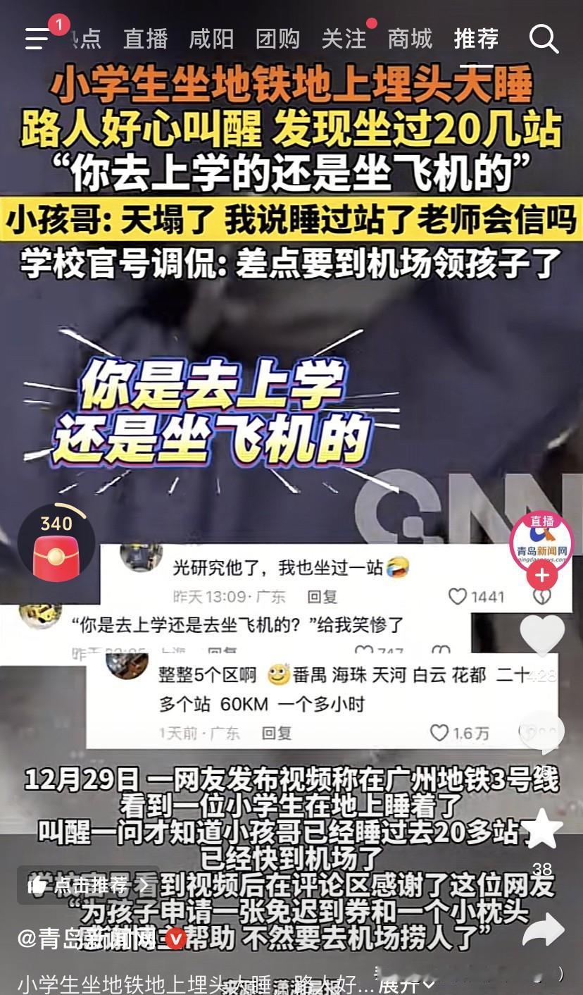 这娃还是瞌睡多! 12月29号,一个男娃坐广州地铁3号线去上学,半路睡着了,还好路人摇醒:“你是坐飞机还是去上学”,但是发现已经坐过了20多站! 20多站,1个多小时呢! 小孩说:天塌了,睡过站了,老师会信吗? 学校说差点要到机场领娃了! 不知道这娃是半夜睡的迟是因为学习还是玩,睡那么迟,导致晚上睡眠不足,白天就打盹,以至于在地铁上睡着了!
