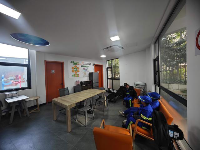 走进位于莲花路的150公交车站点,可以看到让朱阿姨惊喜的这处站点。由爱心接力站、职工工间休息室、艺术长廊、公交站点、公共厕所形成的整体,从外部看十分具有艺术感。而走进站点内部,更是别有乾坤:在户外职工爱心接力站内,除了一应俱全的休息设施外,休息室内还配备了独立的卫生间。“改造以后面积大多了,冰箱、空调都是新的,对我们来说,特别是冬天、夏天,有一个地方休息、吃饭,真的很好。除了我们,还有一些快递、外卖也会来。”更令朱阿姨感到惊喜的是,清扫工具不仅配备了独立的房间,还专门设计了内外两扇门,内门与休息室连通,外门则是直接正对路面,一些大型工具可以直接从外门取出,方便环卫职工工作。