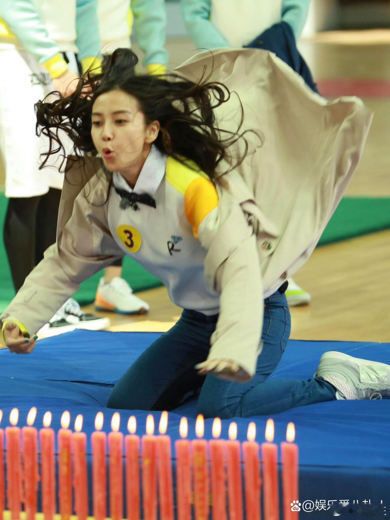 \"杨颖在《奔跑吧》的经典瞬间:自然素颜、舒适睡衣,头发凌乱却充满魅力。\"