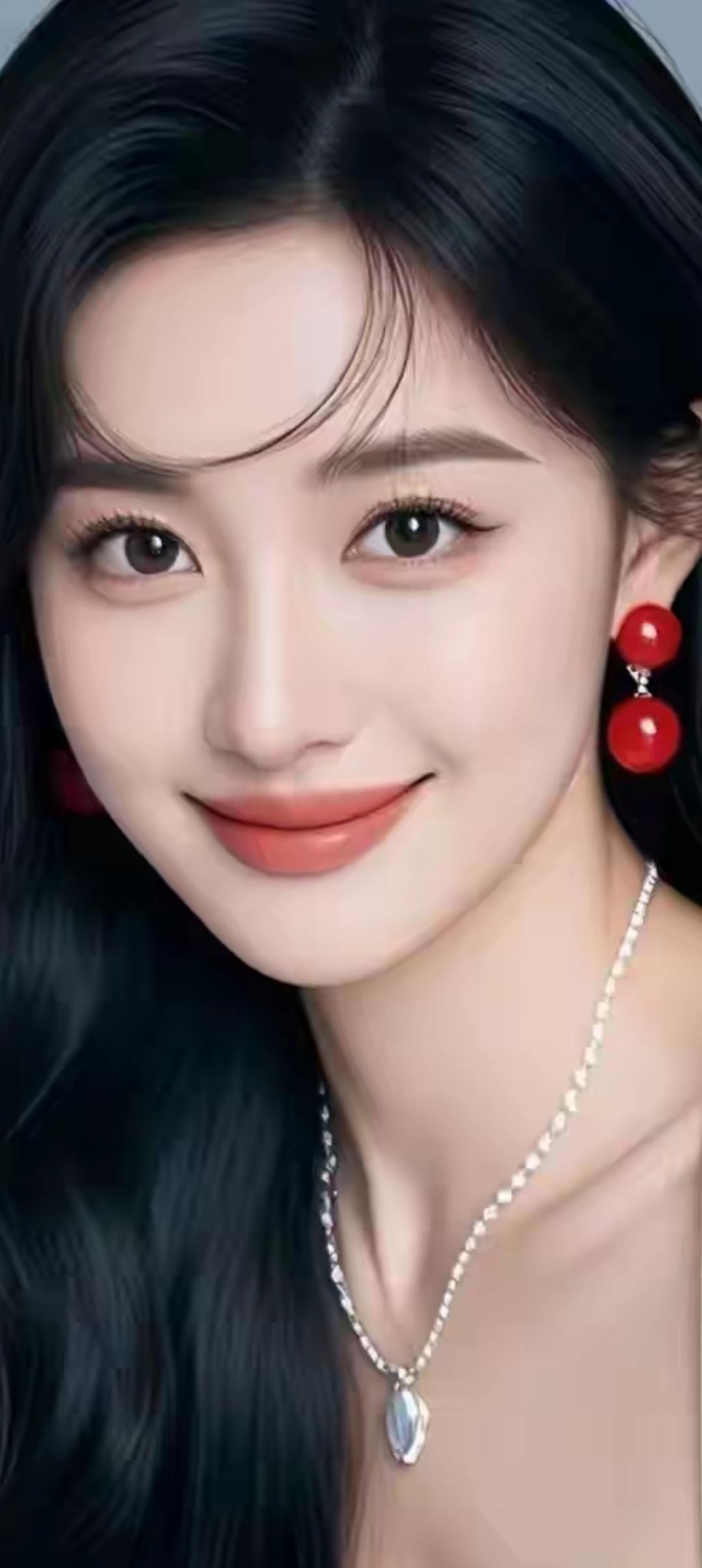 甜美红唇,优雅珍珠,黑发飘逸,女神范儿十足!💄✨💎