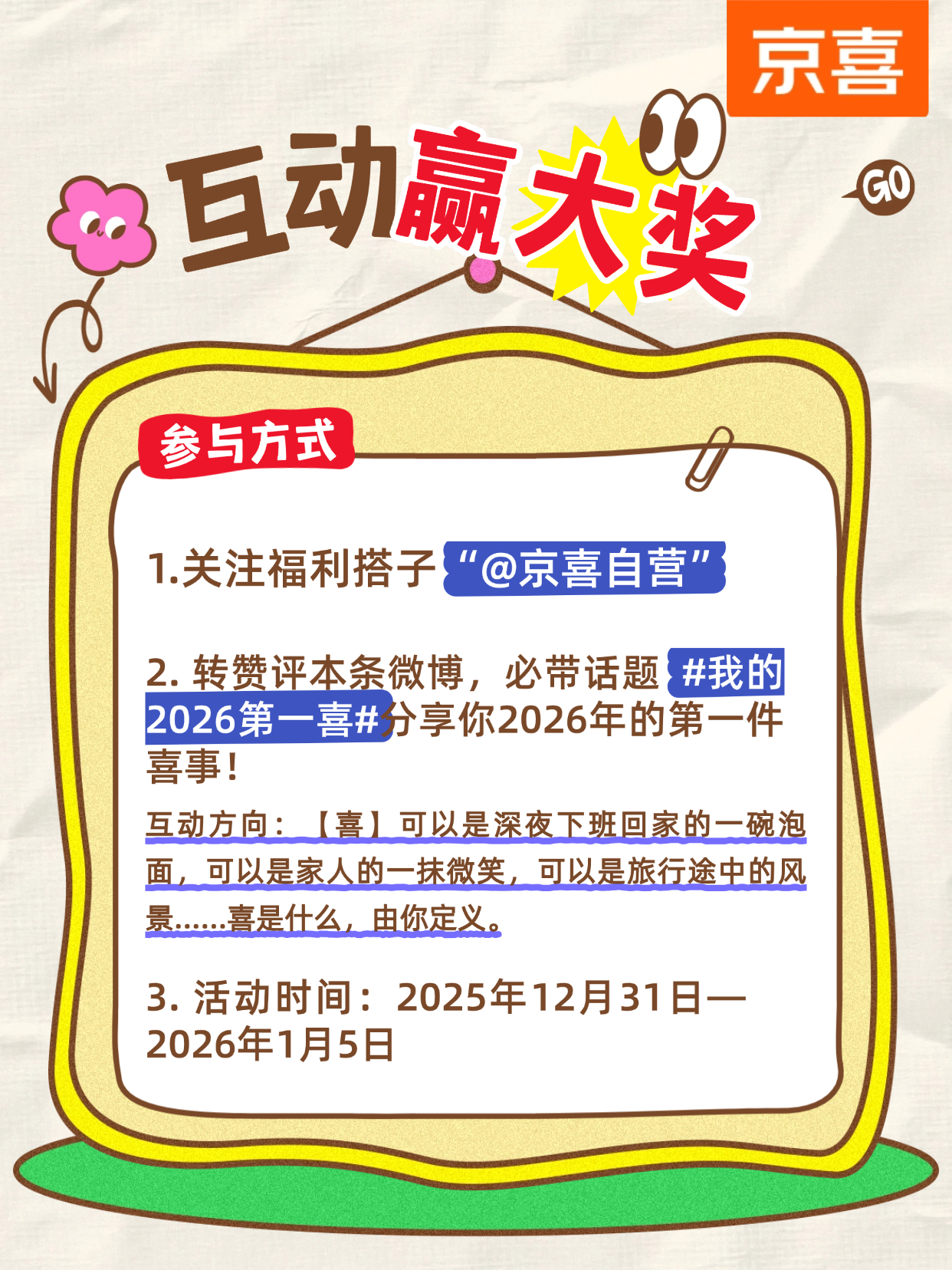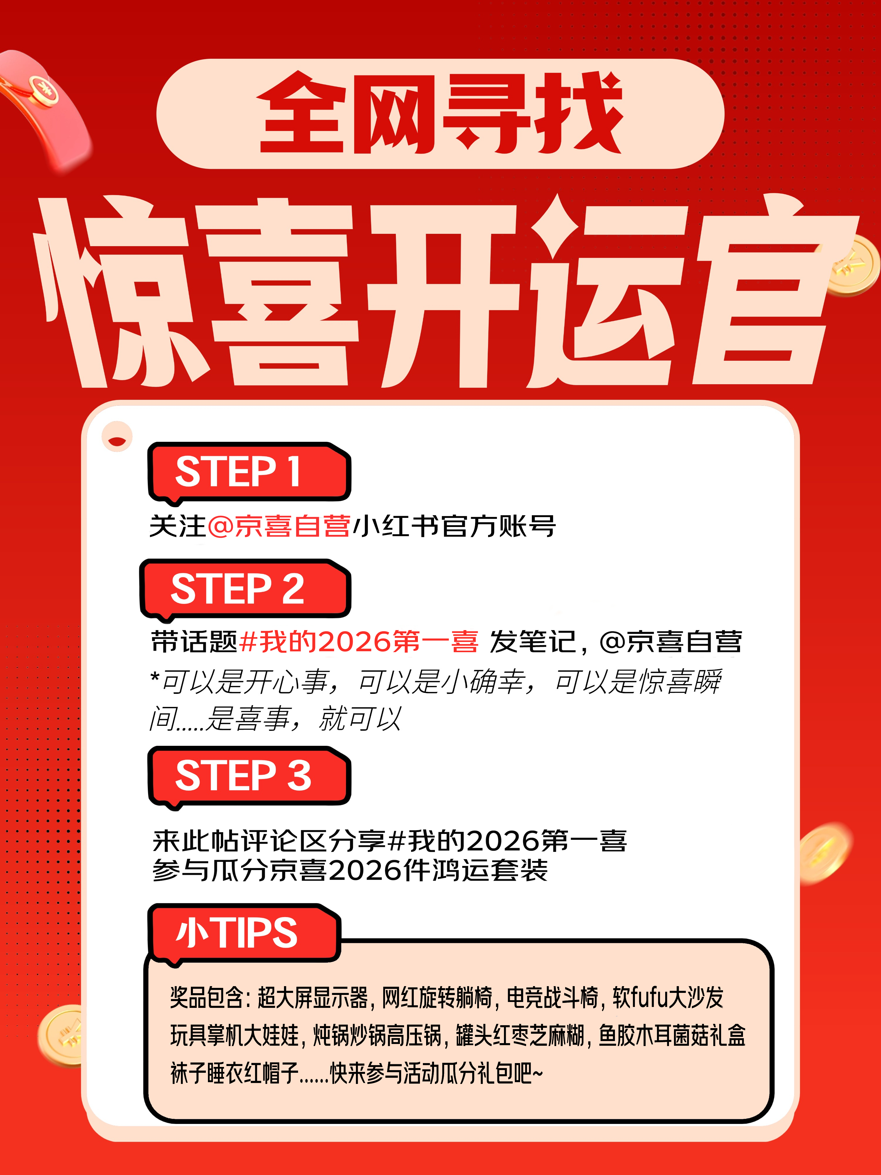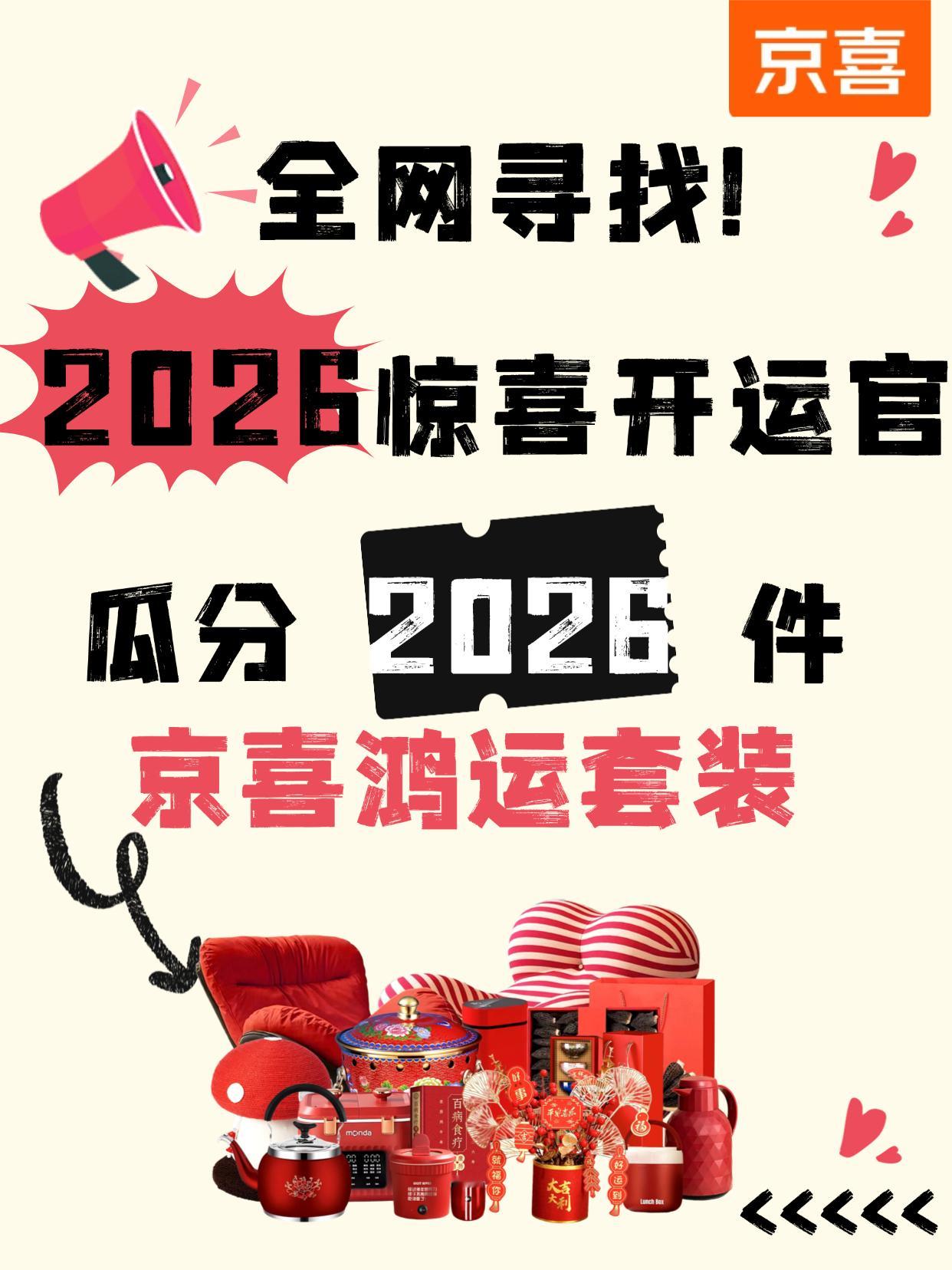 “喜”可以是吃到一块完美的脆皮炸鸡,可以是听到一首单曲循环的好歌,也可以…是成为京东京喜自营2026开运官,直接抱走湖南卫视跨晚抽奖同款京喜2026件鸿运套装!旋转躺椅、电竞装备、锅具食补…全部送你~来转赞评的抽奖微博,带上我的2026第一喜 话题分享你的喜就能参与!简单粗暴,喜气自来~想成为2026惊喜开运官 的快行动!在小红书官号上也能参与哦! 跨晚上京东领你的2026第一份大奖 京喜2026件鸿运套装 湖南卫视跨年节目单 更多京喜好物戳网页链接