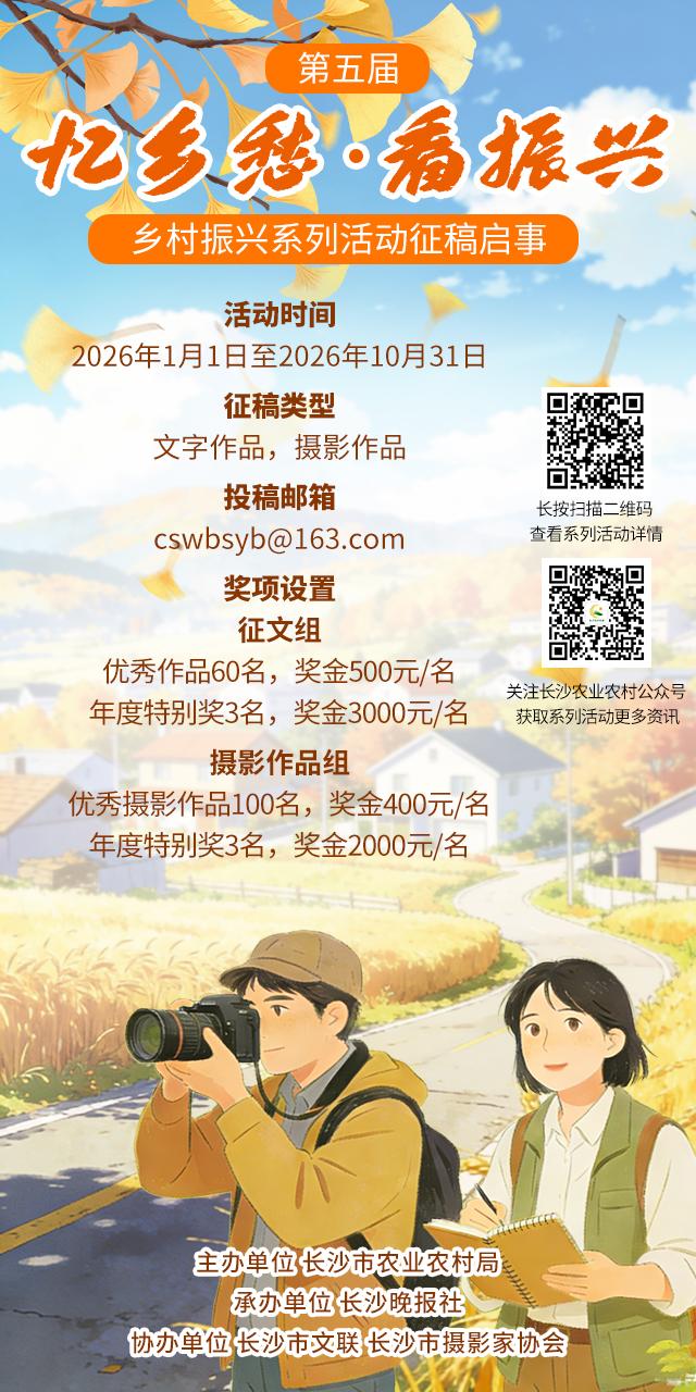 长沙晚报掌上长沙12月31日讯(全媒体记者黄汝兮)2026年1月1日,长沙市第五届“忆乡愁·看振兴”乡村振兴系列活动正式启动,征稿时间将持续至2026年10月31日。活动由长沙市农业农村局主办,长沙晚报社承办,长沙市文学艺术界联合会、长沙市摄影家协会协办,旨在通过文字与影像记录乡村变迁,讲述振兴故事。