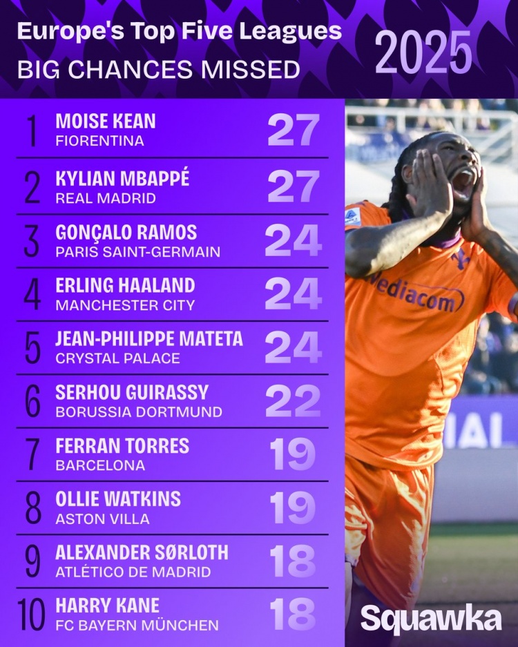 直播吧1月1日讯Squawka统计2025年五大联赛错失重大机会次数榜,基恩、姆巴佩以27次并列第一。