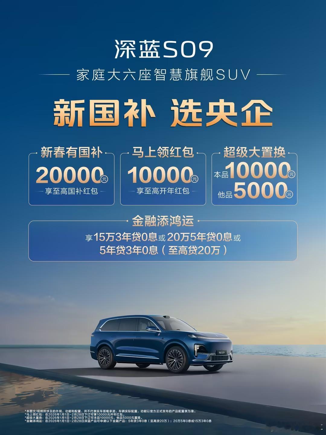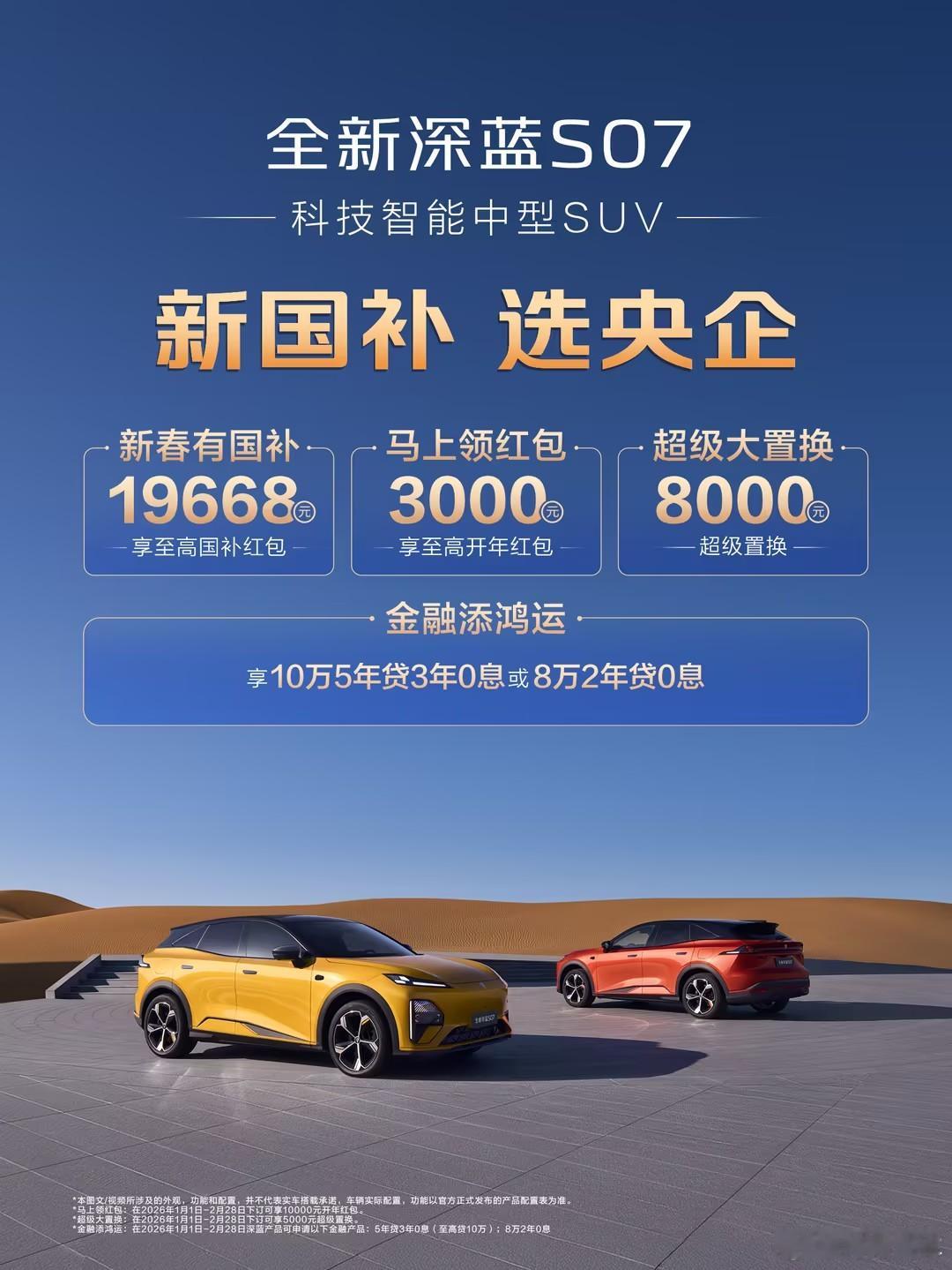 “新国补”政策已开始实施。据了解,深蓝汽车旗下全系车型当前可同步享受国家补贴、购车红包、置换补贴及金融方案四类优惠。对于近期有购车计划的消费者而言,这是一个可以综合了解各项政策的时机。新年国补深蓝性价比拉满