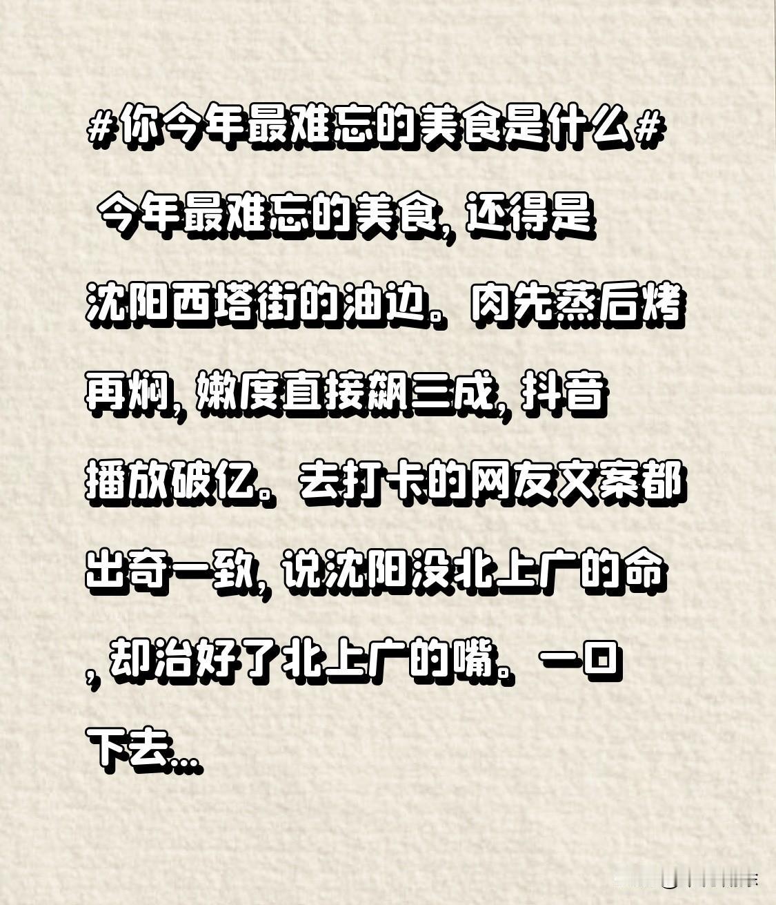 今年最难忘的美食,还得是沈阳西塔街的油边。肉先蒸后烤再焖,嫩度直接飙三成,抖音播放破亿。去打卡的网友文案都出奇一致,说沈阳没北上广的命,却治好了北上广的嘴。一口下去,那鲜嫩多汁的口感,瞬间在嘴里炸开,太香了!美食总能治愈人心,这油边就是我今年的美食宝藏。