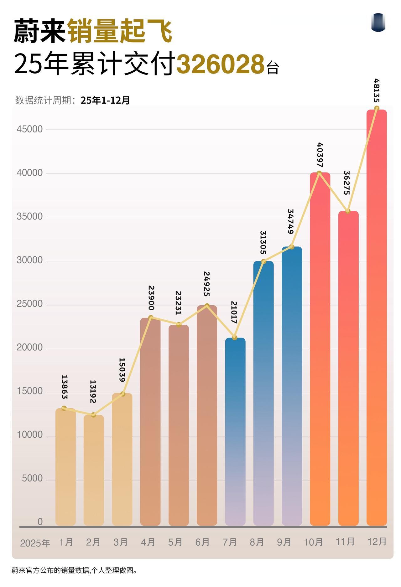 销量大大大超预期!差一点实现蔚5万!蔚来销量一路起飞!12月交付新车48135台! 全年销量超32万台,萤火虫销量再创新高! 蔚来 蔚来萤火虫 蔚来换电去哪都方便
