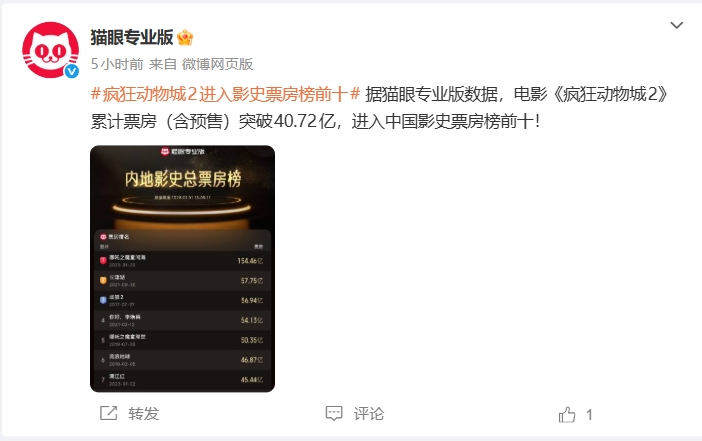 直播吧01月01日讯据猫眼专业版数据,电影《疯狂动物城2》累计票房(含预售)突破40.72亿,进入中国影史票房榜前十。