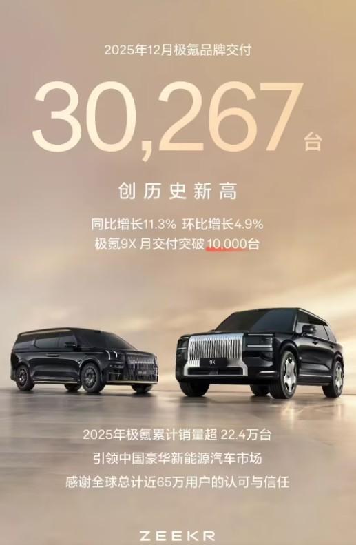 来看新势力12月交付成绩。 鸿蒙智行:12月交付89611辆(其中问界交付超5.7万辆),全年累计589107辆,同比增长32%; 零跑汽车:12月交付60423辆,同比增长42%;全年累计交付596555辆,同比增长103%; 小米汽车:12月交付50000+辆,同时今天还推出YU7 3年0息购车政策; 蔚来公司:12月交付48135辆,同比增长54.6%;全年共交付326028辆,同比增长46.9%; 理想汽车:12月交付44246辆,历史累计交付破150万辆,首个达成的新势力; 小鹏汽车:12月交付37508辆,同比增长2%;全年交付429445 辆,同比增长126%; 极氪汽车:12月交付30267 辆,同比增长11.3%,环比增长4.9%,全年累计销量超 22.4 万辆。 大家表现如何?【来自懂车帝车友圈】