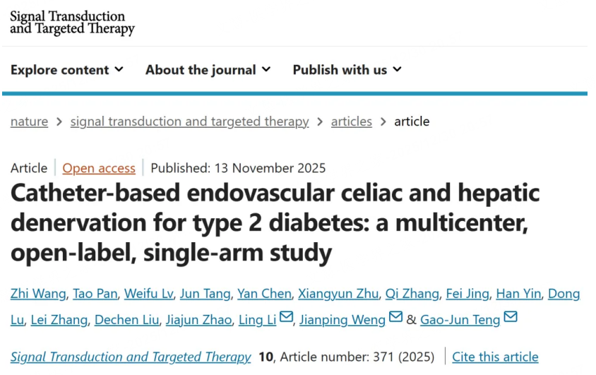 Wang,Z.,Pan,T.,Lv,W.etal.Catheter-basedendovascularceliacandhepaticdenervationfortype2diabetes:amulticenter,open-label,single-armstudy.SigTransductTargetTher10,371(2025).https://doi.org/10.1038/s41392-025-02459-6