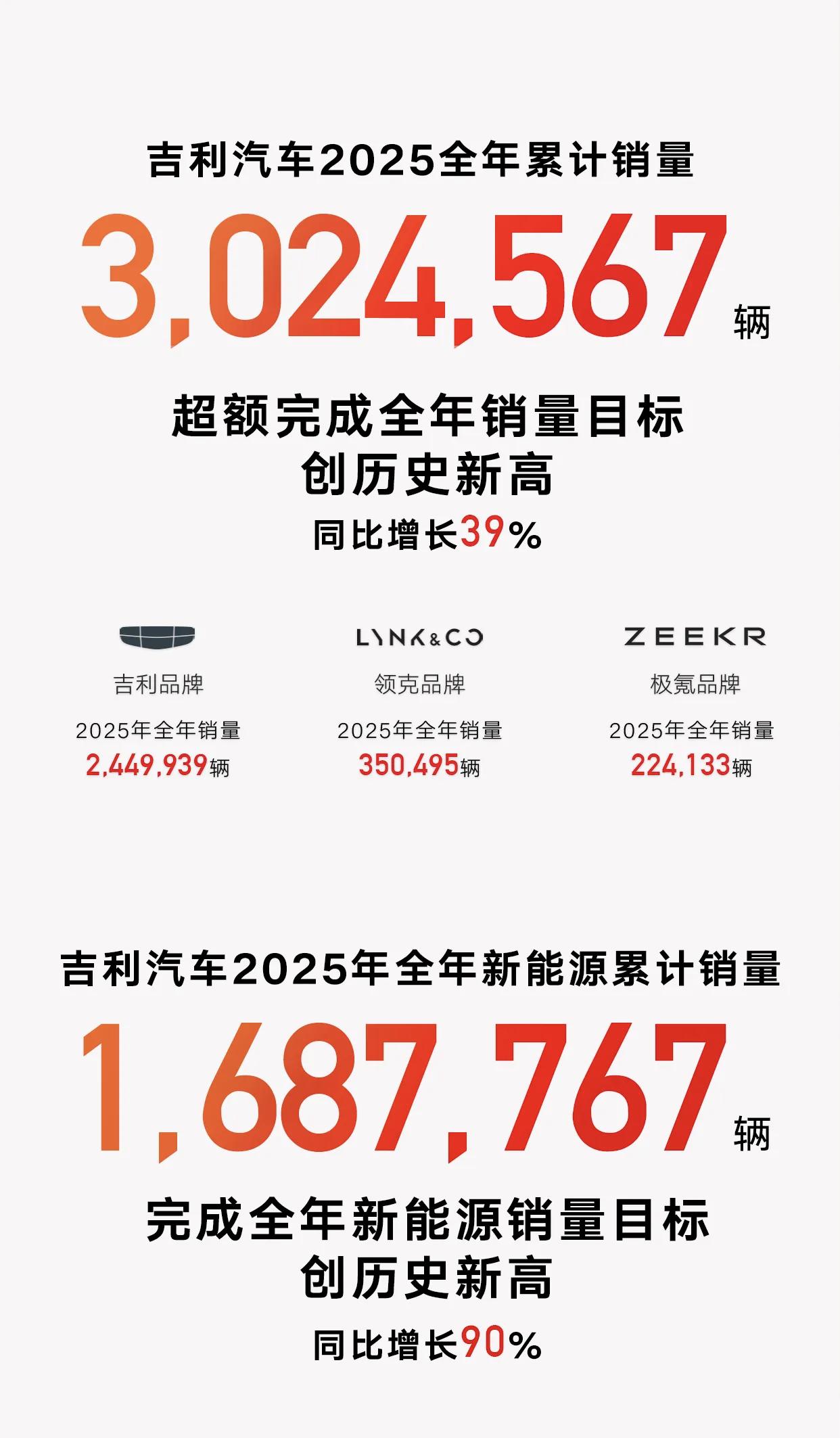 吉利汽车刚刚发布2025年销量数据,全年完成超302万辆,相比2024年超217万的数据,增长幅度非常大! 就这样的增幅,2026年的目标定在345万辆,相比2025年的增幅会不会显得保守呢? 看具体数据,2025年同比增长39%,超额完成300万辆的目标。其中,12月新车销量23.68万辆,同比增长13%。 新能源作为一大销量票舱,整体销量为168.77万辆,渗透率超过50%。其中,吉利银河销量为123.58万辆,同比增长150%,大幅超额完成目标。看数据,其新能源汽车2026年销量目标定在222万辆,还需要增长约32%左右,也就是54万辆左右来填补增量,每个月需要4.5万辆左右的增量。 出口方面也达到42万辆,同比增1%,与奇瑞、上汽、比亚迪相比,还有提升空间。 吉利汽车 吉利汽车销量创新高