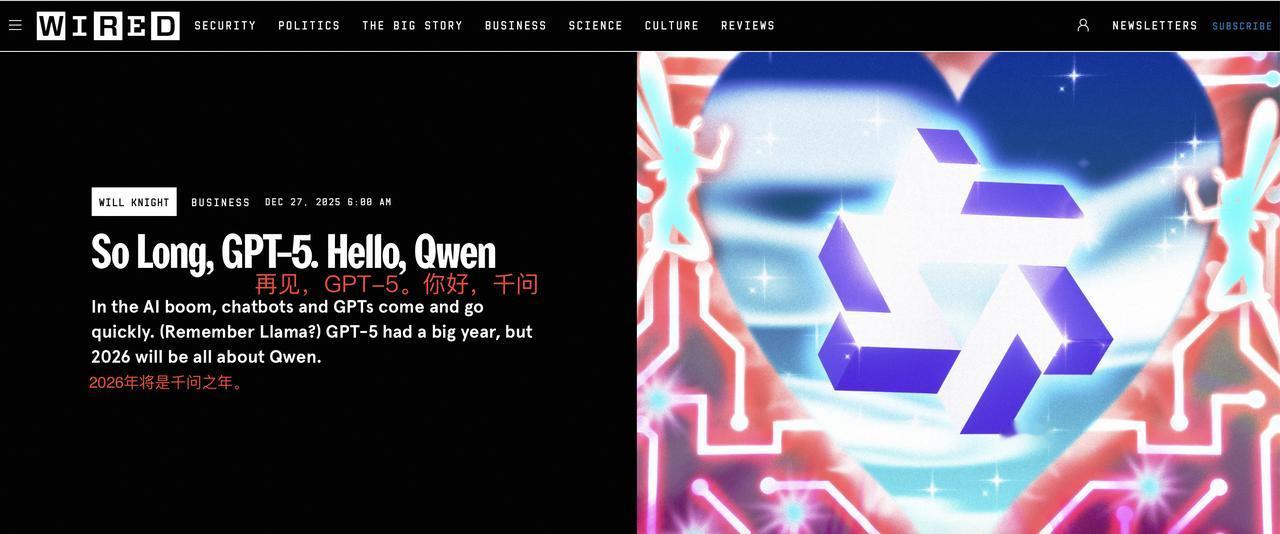 熟悉的一幕再次上演,西方媒体拍手叫好的对象,又是中国! 就在2025年末,美国科技圈的“风向标”《连线》杂志,直接在头版抛出重磅观点:“再见,GPT-5。你好,千问”,明明白白地说2026年将是中国阿里千问的年份,而曾经被寄予厚望的美国GPT-5,压根没激起市场热情。 这波操作让不少人纳闷:一向对中国科技挑三拣四的西方媒体,这次怎么转性了?美国AI巨头栽跟头的背后,藏着哪些门道? 2025年8月,OpenAI带着GPT-5高调亮相,CEO萨姆·奥特曼还放话“这模型让我觉得自己没用”,把AGI(通用人工智能)的期待值拉满。 可没想到发布会刚结束,就彻底翻车:演示时把“52.8%准确率”的柱状图画得比69.1%还高,解释飞机升力原理时还犯了高中物理级别的错误,被全球开发者群嘲。 用户用下来发现,GPT-5比起上一代没啥质的飞跃,不少老用户吐槽“更新无聊”,甚至倒逼OpenAI重新开放旧模型选择。 反观阿里千问,同期在全球开源社区HuggingFace的下载量早就突破7亿次,超过Meta的Llama成了全球第一,连硅谷的Airbnb、英伟达都悄悄把它放进了自己的技术栈,据说Meta内部都在用它开发新一代模型。 有人可能会问,西方媒体这次力挺中国,是不是另有所图?其实核心就一点:在AI竞赛的下半场,“造概念”已经没用了,市场认的是真本事。 《连线》的资深编辑说得很实在,衡量AI价值的关键,不是看它在测试里多“聪明”,而是看它能落地到多少应用里。这恰恰是千问的优势,也是GPT-5的短板。 GPT-5走的还是封闭路线,技术细节藏着掖着,企业想用不仅贵,还难适配自己的需求;而千问走的是开源路子,一口气放了近400款全尺寸、全模态模型,支持119种语言,不管是小公司做智能硬件,还是大企业搞复杂推理,都能直接拿来用,边际成本低到可以忽略。 就像杭州的智能眼镜公司Rokid,靠千问模型实现了实时翻译并投射文字,比亚迪把它放进车载助手,OPPO、vivo在手机端大量部署,这些看得见摸得着的应用,比任何宣传都有说服力。 至于大家关心的“帕帕罗发言原话”,这里要澄清一下:搜索权威报道后发现,近期相关核心报道中,并无所谓“帕帕罗”的公开发言。 可能是存在名称混淆——在中美AI竞争的相关讨论中,OpenAI CEO萨姆·奥特曼曾在国会听证时提到中国AI,原话是“我们相信,美国的模型,包括 OpenAI 和 Google 以及其他公司的一些模型,是世界上最好的模型”,同时他也承认“中国团队DeepSeek做了一个很好的开源模型,模型本身不再是唯一的核心壁垒”。 而《连线》报道中引用的是美国Laude Institute联合创始人安迪·康温斯基的观点,原话是“许多科研人员都在使用Qwen,因为它是目前最好的开源大模型”。 《连线》这次“力挺中国AI”,不是什么刻意捧杀,而是市场选择的客观反映。美国AI巨头之所以陷入困境,本质是战略跑偏了——光顾着造“AGI临近”的概念、追求测试榜单上的分数,却忽略了企业和开发者的真实需求。 反观千问的崛起,靠的是开源生态的底气和落地能力的扎实,这也说明中国科技企业已经从“跟跑”变成了“领跑”,开始掌握AI模型层的话语权。 从全球下载量第一到被硅谷巨头悄悄采用,千问的故事证明:真正有价值的技术,从来不会被国界限制。 2026年是不是“千问之年”还不好说,但可以肯定的是,AI竞争的胜负手,已经从“谁更聪明”变成了“谁更有用”,而这一次,中国企业找对了方向。