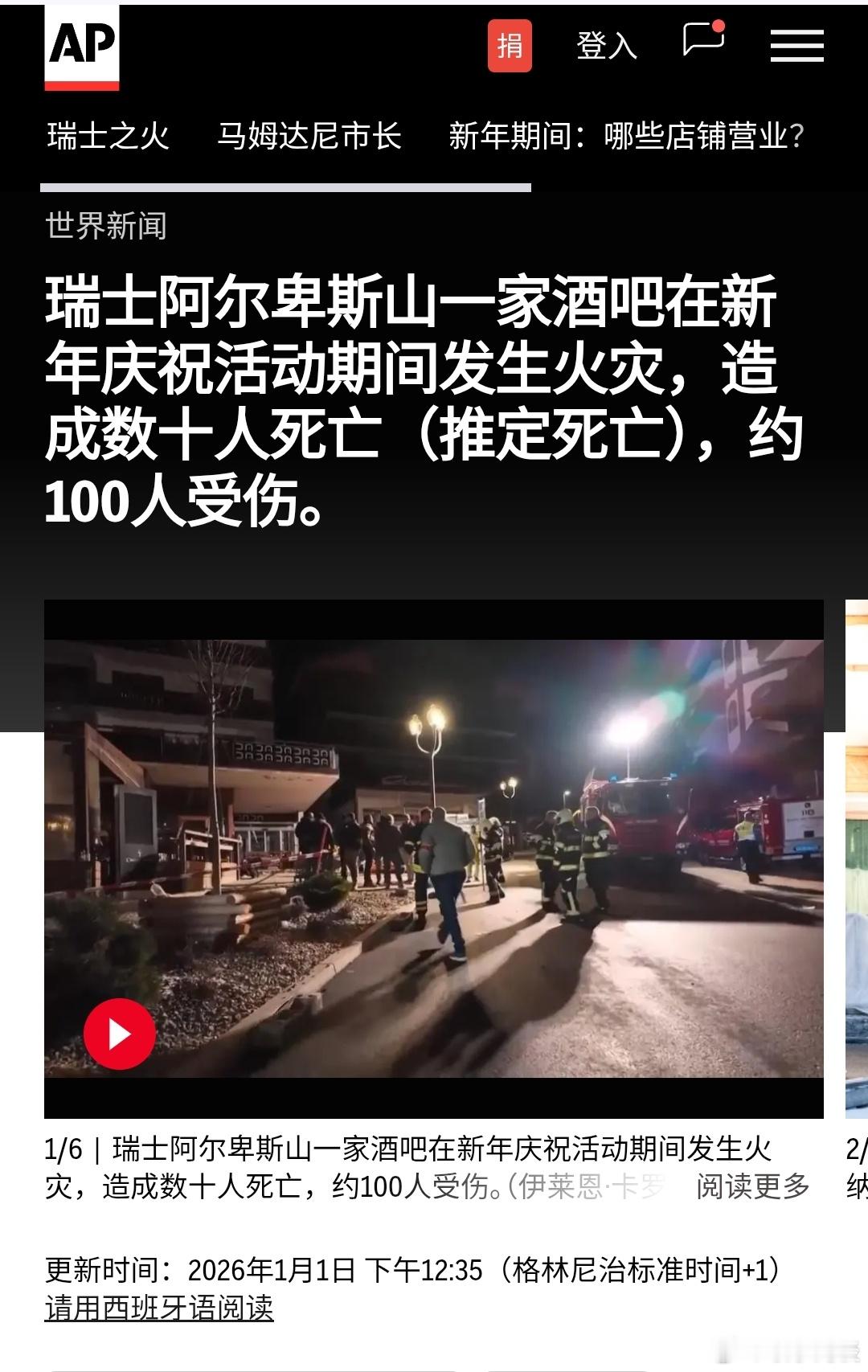 瑞士滑雪胜地爆炸多人死伤(美联社)——警方周四表示,在瑞士阿尔卑斯山度假小镇克兰斯-蒙塔纳的一家酒吧发生火灾,当时正值新年庆祝活动期间,据信已有数十人死亡,约 100 人受伤,其中大多数人伤势严重。瓦莱州警察局长弗雷德里克·吉斯勒在新闻发布会上表示,在 Le Constellation 酒吧发生的“数十人”死亡事件中,数十人丧生。吉斯勒表示,目前正在进行确认受害者身份和通知其家属的工作,但“这需要时间,目前给出更准确的数字还为时过早”,并补充说,社区“遭受了沉重打击”。瓦莱州检察长比阿特丽斯·皮卢德表示,现在确定火灾原因还为时过早。专家们目前还无法进入废墟内部进行调查。皮卢德说:“目前根本不存在任何形式的袭击问题。”官员称,直升机和救护车迅速赶到现场救助伤者,其中一些伤者来自不同国家。两名女子向法国电视台BFMTV透露,她们当时正在酒吧里,看到一名酒保扛着一名女招待。女招待手里拿着一个装在瓶子里的点燃的蜡烛,蜡烛引燃了木质天花板。她们告诉电视台,火势迅速蔓延,导致天花板坍塌。其中一名女子描述了人群涌动的情景,人们疯狂地试图从地下夜总会逃出,沿着狭窄的楼梯穿过一扇狭窄的门。另一位目击者向BFMTV电视台描述说,人们砸碎窗户逃离火海,一些人受了重伤,惊慌失措的父母开车赶到现场,查看自己的孩子是否被困在里面。这位年轻人说,他看到大约20人争先恐后地从浓烟烈火中逃生,他站在街对面目睹的情景就像恐怖电影一样。官员们称这场大火为“embrasement généralisé”,这是一个消防术语,用来描述大火如何引发可燃气体的释放,这些气体随后会猛烈燃烧,造成英语消防员所说的闪燃或回火。“今晚本应是庆祝和团聚的时刻,却变成了一场噩梦,”地区政府首脑马蒂亚斯·雷纳尔说道。雷纳尔说,伤者人数众多,导致地区医院的重症监护室和手术室很快就满负荷运转。