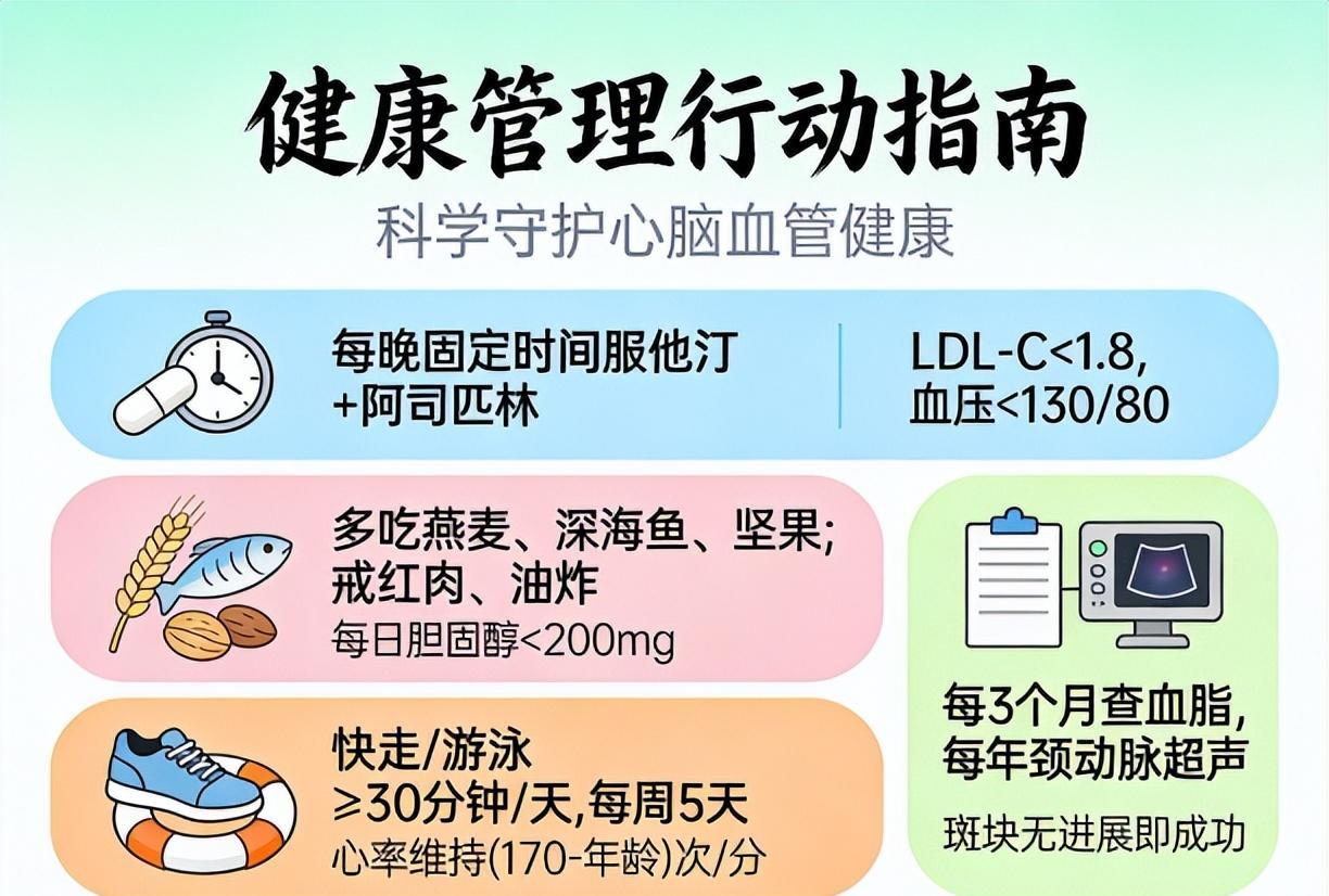 2025年,国家卫生健康委发布新指南。早干预,药物加生活方式,一些人狭窄可从75%降到40%以下,斑块稳住,部分逆转。前提清楚:斑块未钙化,无严重闭塞或症状性缺血,规范坚持12–24个月。数据硬,30%–40%患者减少≥20%,有人从75%降到36%。用药要全套:他汀打底,控压、抗栓一起上。行动别掉链子:地中海饮食,每天坚果25g,LDL-C降5%–10%;快走骑车游泳,深蹲弹力带;烟别碰,抽1支损伤6小时。别犯错:血脂正常也别停他汀,保健品不替代;没症状也要管,70%心梗出在轻度狭窄。态度明确:窗口期别错过,坚持,血管会给你面子。