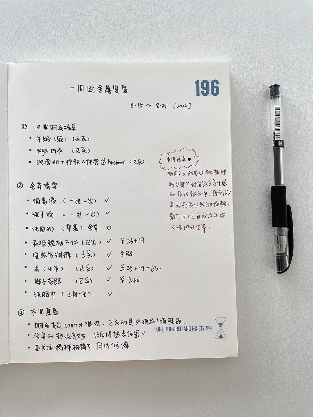 详细列出这周的断舍离物品,已经出了的物品可以打✔️,一目了然。这周复盘时原来我断舍离了很多物品,也挣到了💰,写的时候好快乐!