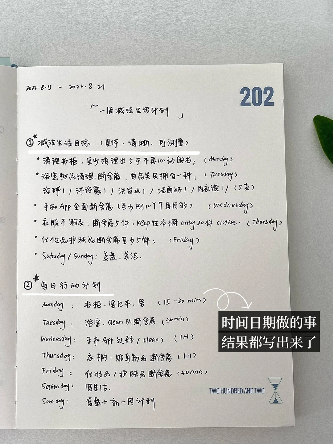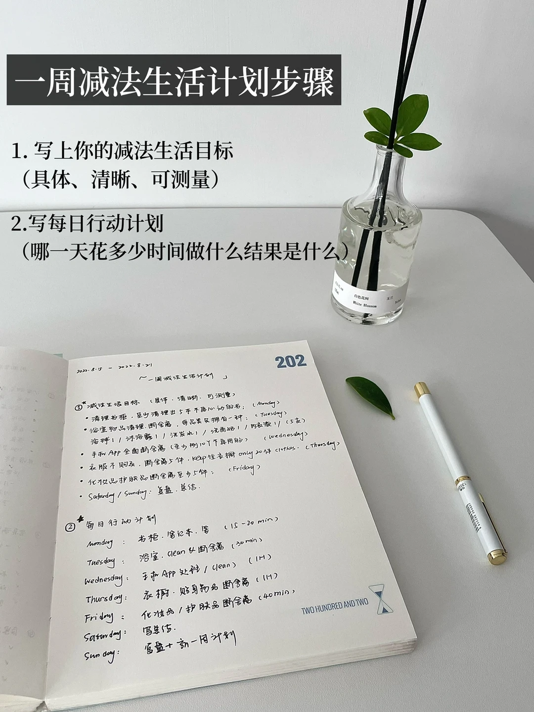 🍃明天就是周一,提前做好一周减法生活计划,让目标存在于内心,更能过上减法生活。我们尝试每天花15分钟做一次减法生活,并记录。以下是步骤具体实践: