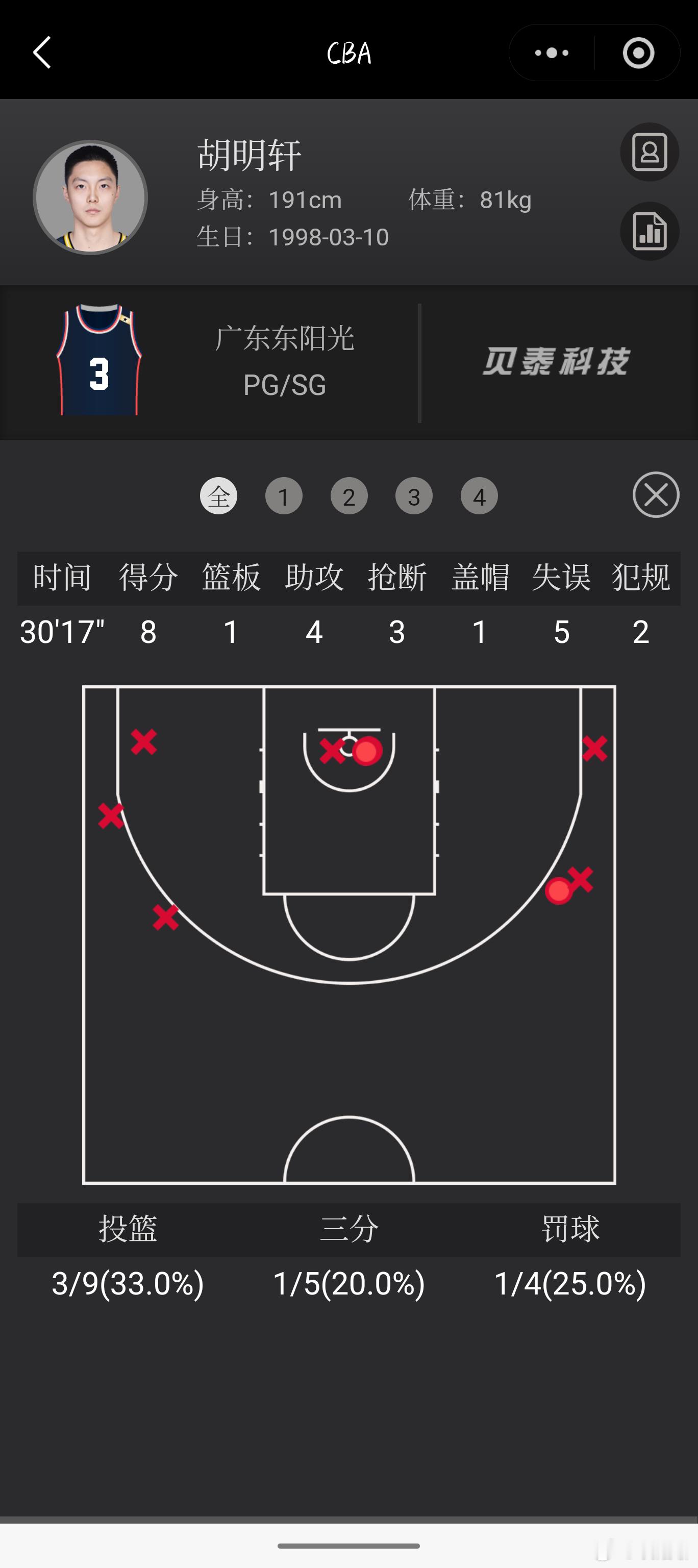 虽然胡明轩不论是在广东队还是在国家队都会打1号位,但是他对1号位的打法还是不那么适应,有些不好的习惯。例如图1当中,他在接近中圈的地方停球,准备传球跑战术,但很明显传球路线被封堵,这个时候只能是右边45度角来接应才有办法跑出接下来的战术,进攻时间就这样流失了。这只是比较好的情况,如果两边的人都被封堵,对位人再紧贴干扰,这个球怕是很难走完完整战术。最好的应该是尽量靠近三分线等待队友跑位,然后自己也不要结束运球,那这个回合的选择就有很多种了。