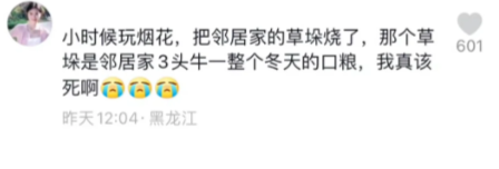 小时候玩烟花,把邻居家的草垛烧了,那个草垛是邻居家3头牛一整个冬天的口粮, 我真该死啊
