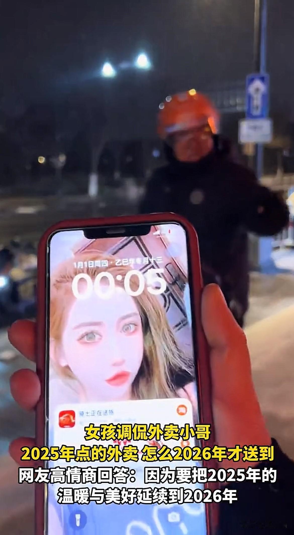 看哭了!河南,两位女生在跨年夜点了外卖,外卖员送到时刚好过了零点,女生调侃:“我2025年点的外卖,你怎么2026年才送到?”外卖员的回复让网友大赞情商高。 这两位女生相约一起跨年,等着等着有点饿了,就点了个外卖,让美食陪伴一起跨年,外卖员送到时,女生记录下了这暖心的一幕。 女生接过外卖,对外卖小哥调侃到:“我2025年点的外卖,你怎么2026年才送到?” 外卖小哥愣了一下,反应过来,顾客不是责备他,是跟他开玩笑呢,于是笑着回复了一句:“新年快乐!” 两位女生笑出了声,回应小哥说:“新年快乐,谢谢哥,辛苦了,路上小心。” 网友给出更高情商的回答,因为要把2025年的温暖和美好延续到2026年。 也有网友说,因为我想做2026年第一个给你送外卖的人。 这次独特的跨年给了他们一份特别而温暖的回忆,寒冬也因为他们的理解和包容多了一丝温暖。外卖小哥在这么冷的冬天送餐不容易,顾客多点包容,多点理解,让这个世界充满着温暖和美好。