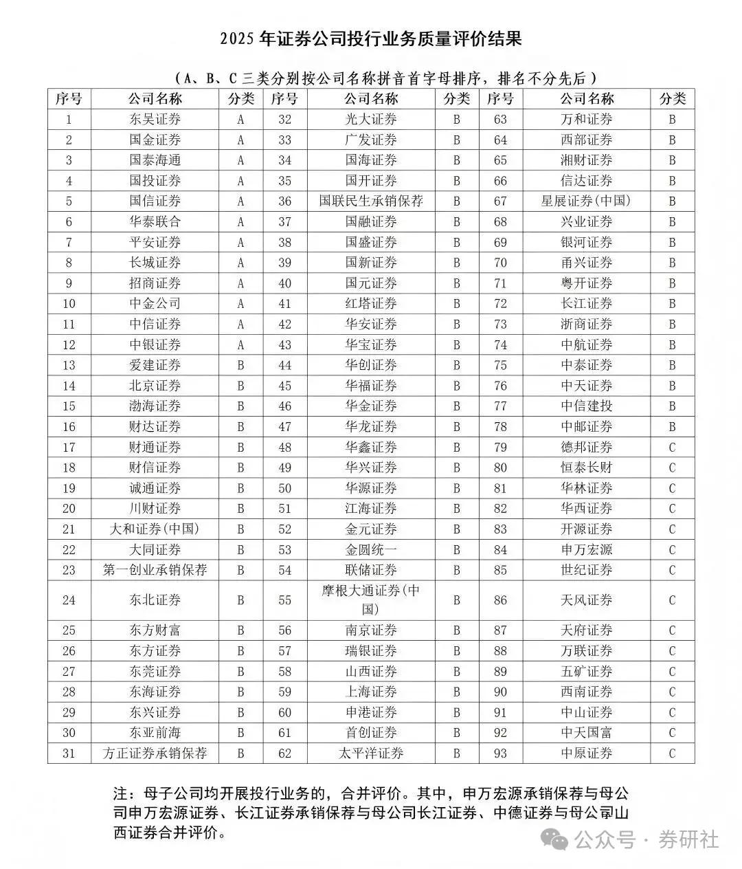 2025年12月30日,中国证券业协会发布通知,据证监会工作部署,协会组织开展了2025年证券公司投行业务质量评价,评价结果已按照规定履行完成相关程序,现予公布。