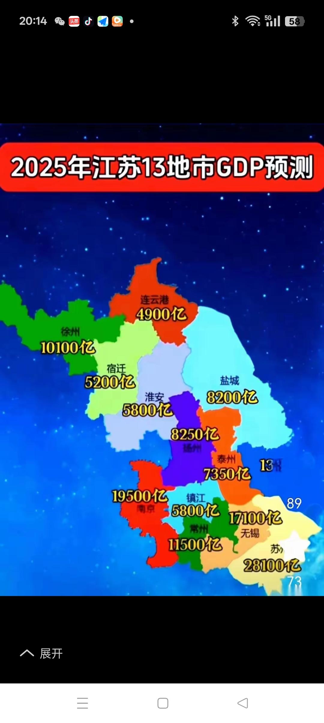 江苏2025年终盘点 2025年,江苏13大保GDP预测数出炉了。 年终盘点的大致结果为: 一、苏北的领头羊徐州2025年也加入了万亿俱乐部的行列,至此,江苏共有6个城市的GDP超万亿元,占全省地级市以上城市总数的近半,成为全国GDP超万亿城市最多的省份。 二、全国最强的地级市苏州GDP达到28100万元,超过包括南京在内的相当部分的省会城市。 三、苏北的盐城和苏中的扬州GDP超8000万元,预计2027年左右,江苏会再增加两座GDP超万亿的城市。 四、作为江苏经济第三方阵的苏北,淮安、宿迁GDP也超5000万元,最差的连云港也达到4900万元,再经过五年的努力,将会迎来苏北振兴的新时代。 五、苏南是江苏经济的第一方阵,除镇江外,均迈入GDP亿元俱乐部,镇江还需再加把劲。 六、作为江苏经济第二方阵的苏中,南通、泰州连同扬州,发展稳健,并很好地发挥了接轨苏南、带动苏北的作用。