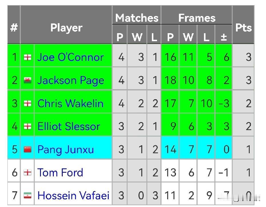 冠军联赛第一组首日比赛, 奥康纳暂列第一,庞俊旭排第五。韦克林打出单杆147,目前暂列第三。 昨夜今晨,邀请赛版的冠军联赛第一组开始进行,结果如下:奥康纳和佩奇都是3胜1负积3分,分列第一和第二,韦克林在与庞俊旭的比赛第一局打出个人职业生涯第一杆147,目前2胜2负积2分,暂列第三。 斯莱瑟2胜1负积2分,排在第四。 庞俊旭进行了3场比赛,2-3负佩奇,3-1胜福德,2-3负韦克林,目前积1分,列小组第五,福德也是1胜2负积1分,列第六,瓦菲3战皆负,排名垫底。 按照规则,前4名出线,庞俊旭还剩3场比赛,今晚明晨分别迎战奥康纳、瓦菲和斯莱瑟。希望庞俊旭加把油! 按照赛程,进入前4的球员,将在明天凌晨进行交叉半决赛,获胜者晋级决赛,最终决出本组冠军。
