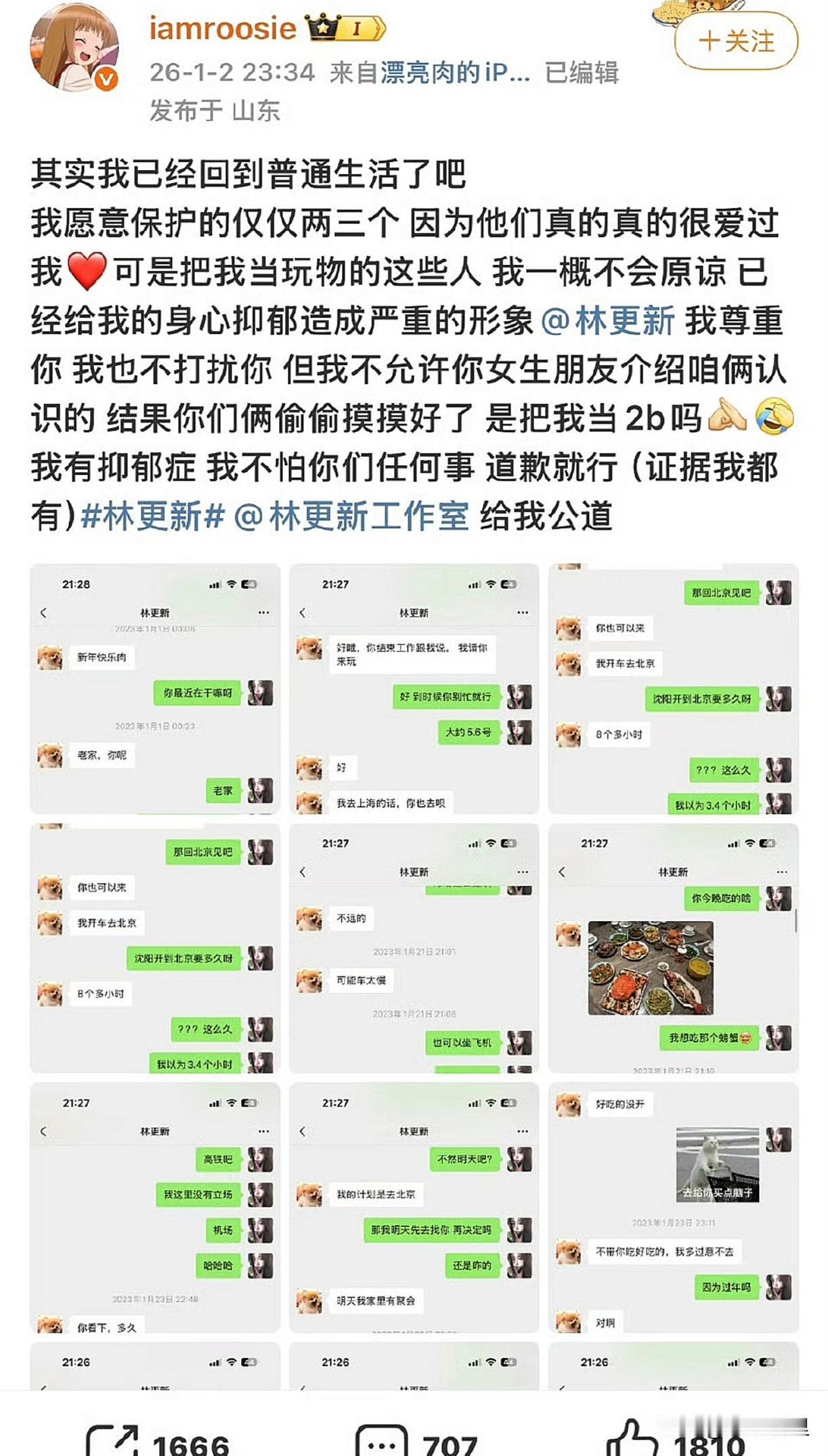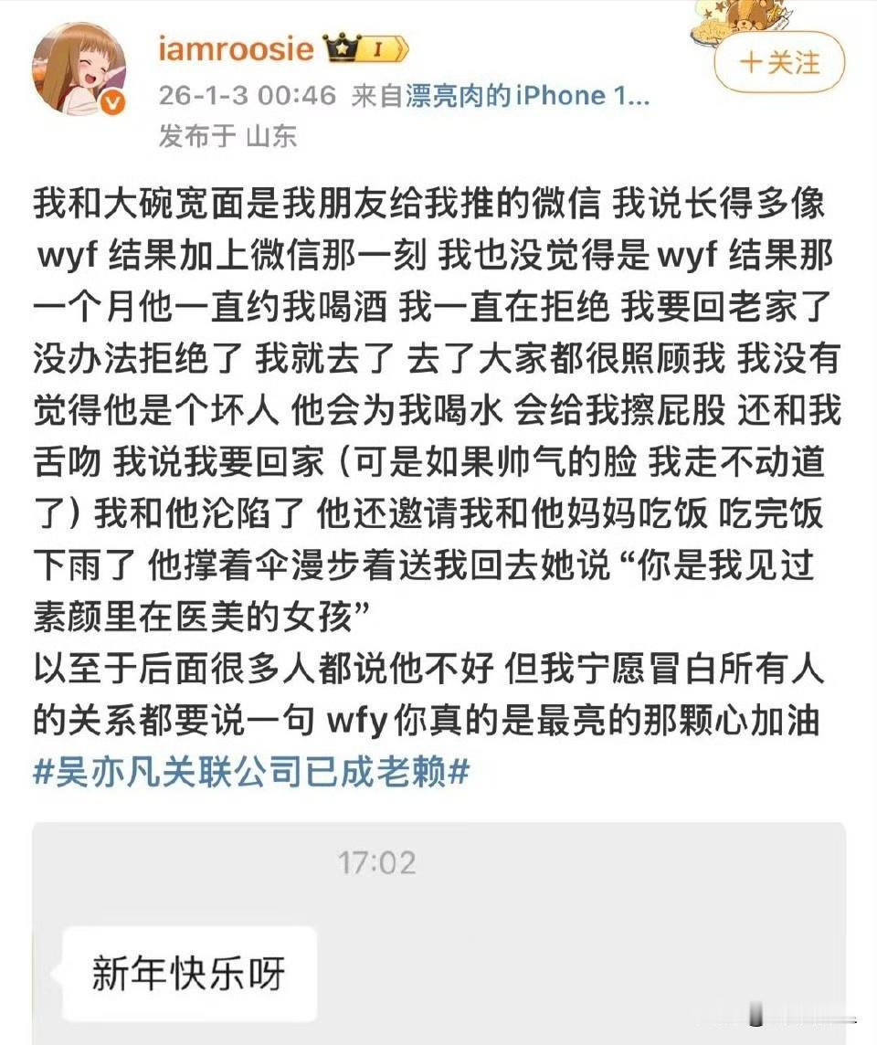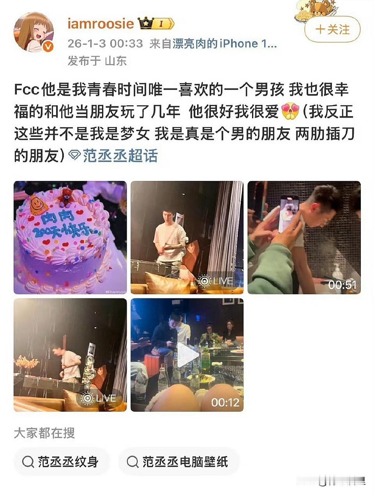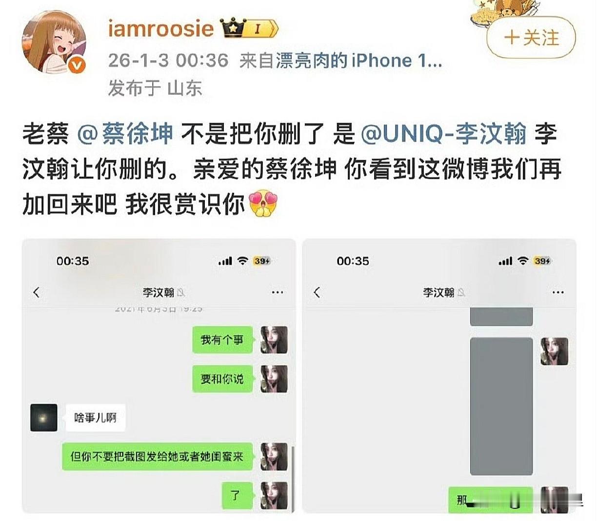 一夜醒来,娱乐圈出大瓜了[捂脸]。 “iamroosie”的一条微博炸翻半个内娱,林更新、蔡徐坤、鹿晗、范丞丞,全都上榜。最后离场时,还扔下一句“所有顶流都睡完了”,这杀伤力太吓人了。 目前鹿晗、范丞丞火速进行澄清,表示是对方“纯属臆想”,并已经保留证据,可网友不在乎真假,却high起来了,直接封2026为“司晓迪元年”。 爆料无需证据,流量先跑三圈。其他明星工作室确实该醒醒了,这年头,谣言跑得比声明快多了。
