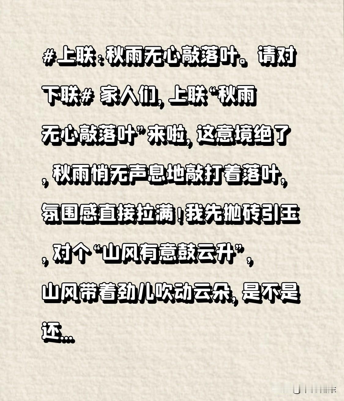 家人们,上联“秋雨无心敲落叶”来啦,这意境绝了,秋雨悄无声息地敲打着落叶,氛围感直接拉满!我先抛砖引玉,对个“山风有意鼓云升”,山风带着劲儿吹动云朵,是不是还挺搭?大家也赶紧发挥文采,一起在评论区对下联,看看谁才是对联高手!
