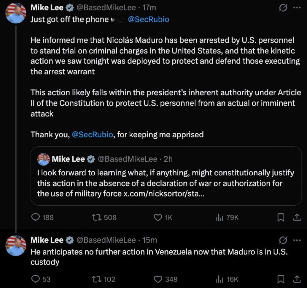 据美联社报道,美国犹他州参议员迈克·李Mike Lee表示,特朗普政府已向他通报,马杜罗将在美国面临刑事指控。