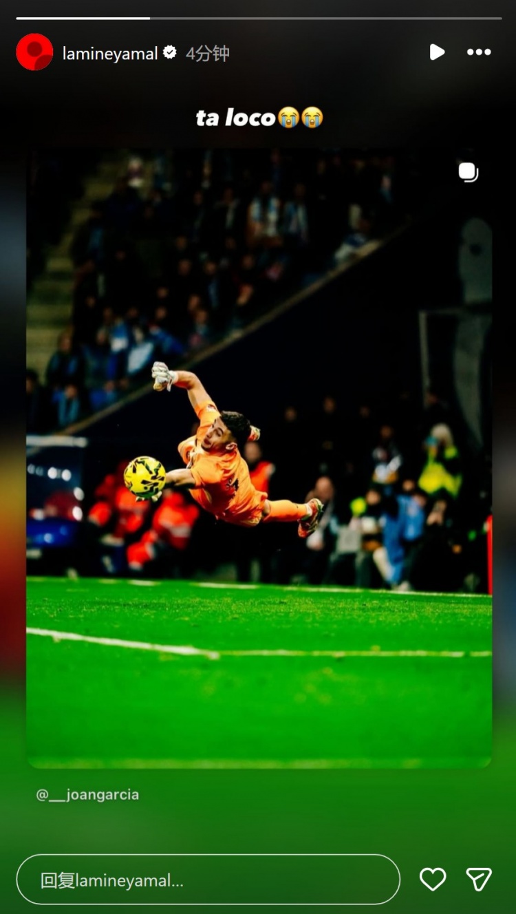 亚马尔赛后更新社媒动态,晒出霍安·加西亚扑救的照片,配文:“你太离谱了吧!(疯了)”