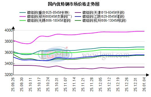 市场方面:元旦节后首个交易日,市场情绪由节间平稳过渡至谨慎观望。贸易商暂无主动调价意愿,稳价启市为核心思路,仅个别流通规格存在零星议价空间,市场报价体系整体稳固,未出现明显波动。据兰格钢铁网监测,今日国内优特钢市场价格主稳运行,现货端各区域均延续节间平稳格局。分地区来看:华东地区锡杭等核心市场,碳合结钢资源主流报价锚定节前水平,无锡45#碳结钢主流规格含税报价3720-3740元/吨,杭州同规格报价3640-3660元/吨,贸易商以明价出货为主,议价弹性维持低位,整体未脱离主流价格区间;轴承钢、齿轮钢等高端品种报价延续坚挺,无锡齿轮钢主流规格含税报价4060-4090元/吨,资源偏紧无让利空间,交投氛围偏淡,下游终端暂无批量补库动作。华北、华中地区优特钢市场同步平稳运行,华北区域天津45#碳结钢主流规格含税报价3330-3350元/吨,邯郸齿轮钢主流规格报价3830-3860元/吨,碳合结钢报价框架稳固,市场流通资源充裕,前期无低价资源扰动,报价统一性较强;华中区域武汉45#碳结钢主流规格含税报价3590-3610元/吨,长沙齿轮钢主流规格报价4000-4020元/吨,轴承钢等品种代理挺价立场明确,报价无明显波动。贸易商操作以顺价出货、平稳流转为主,聚焦库存优化与资金回笼;下游制造企业节后复工节奏平缓,采购需求逐步恢复但尚未完全释放,询单频次处于低位回升阶段,采购完全遵循按需补库原则,成交以刚需小单为主,整体流通节奏温和。综上,节后首市国内优特钢市场缺乏趋势性运行动力。预计短期内国内优特钢市场将延续稳价格局。