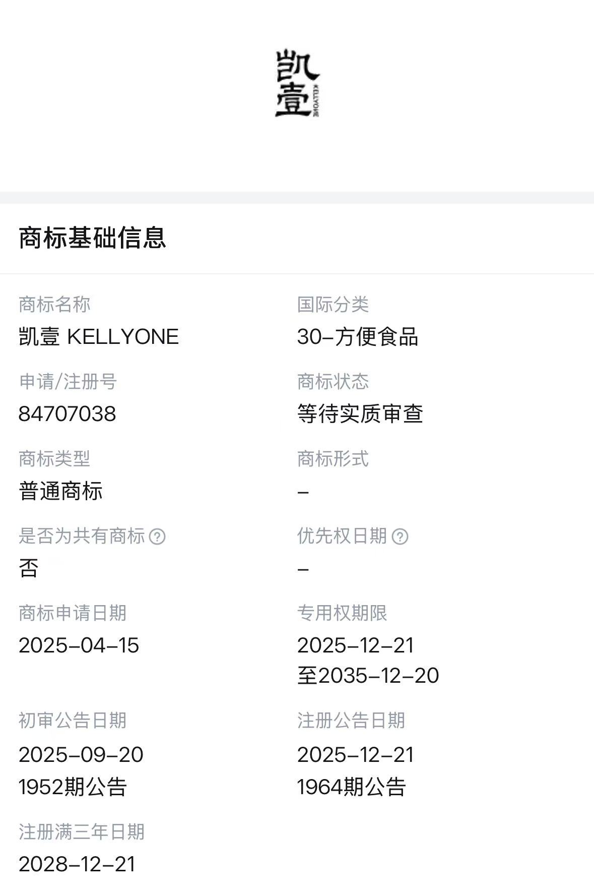 此外,宏胜饮料系杭州恒泽食品饮料有限公司的最新动态显示,“KELLYONE凯壹”商标被注册通过,国际分类为“30-方便食品”,专利权期限为2025年12月21日至2035年12月20日。天眼查信息显示,恒泽食品饮料有限公司成立于2020年9月,注册资本100万美元,法定代表人为郑群娣,执行董事为宗馥莉。