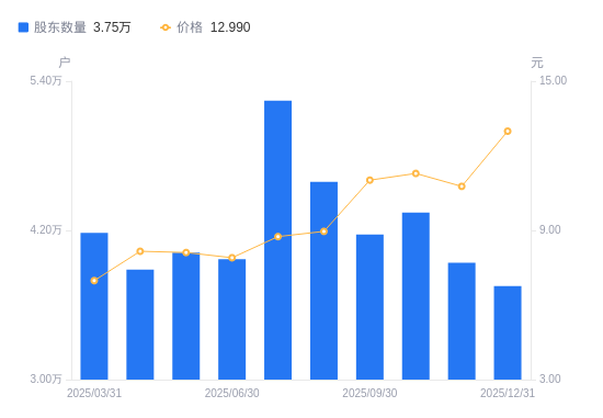 近一年(2024年12月31日至2025年12月31日),上峰水泥A股股东户数从4.29万户,减低至3.75万户,降幅12.59%,区间股价上涨80.17%。