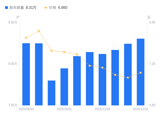 日期A股户数(户)流通A股户均持股数(股)户均持股市值(万元)2025-12-318305321514.7714.762025-12-208244021674.7514.462025-12-108169121873.4814.832025-11-288120522004.3915.542025-11-208143621941.9715.642025-11-108094722074.5216.712025-10-317946922485.0717.222025-10-207799922908.8317.662025-10-108249521660.3018.352025-09-308249721659.7717.78